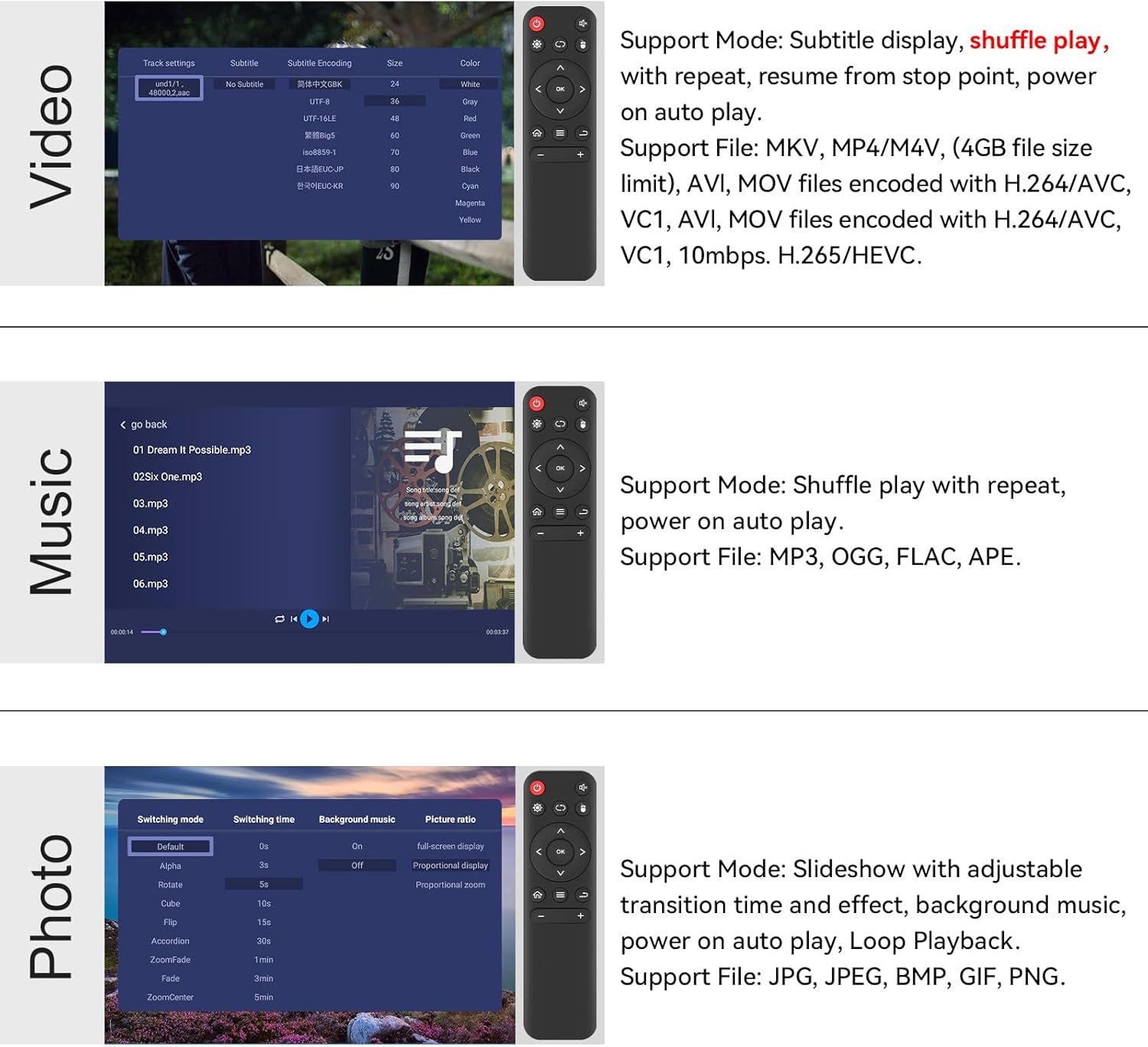 Видео формат: RM, RMVB, AVI, DIVX, MKV, MOV, HDMOV, MP4, M4V, PMP, AVC, FLV, VOB, MPG, DAT, MPEG, TS, TP, M2TS, WMV (H.264, H.263, WMV9/VC-1, MPEG1/2/4). H.264 MP4 форматът поддържа до 4GB на файл. Аудио формат: MP3, WMA, OGG, AAC, FLAC, APE, AC3, ATRA. Формати на субтитри: SMI, SSA, SRT, SUB. Формат на снимки: BMP, JPG, PNG, GIF (неподвижно изображение).