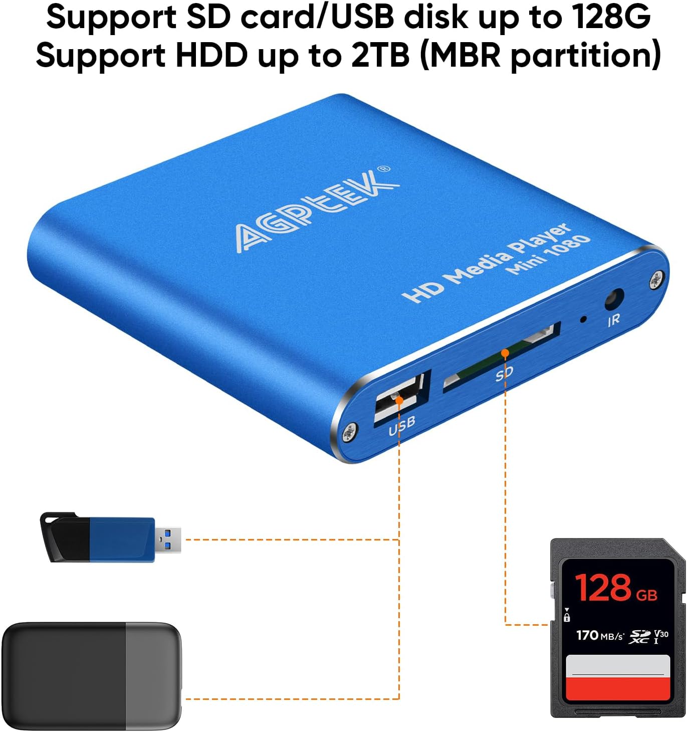 • Мощна съвместимост: може да се възпроизвежда от micro SD карта, USB флаш устройство с до 256 GB и твърд диск с до 8 TB, включително FAT32, exFAT и NTFS; устройството има вградена 11G памет, която може да съхранява любимите ви филми или снимки. Два USB порта за свързване на две устройства, поддръжка на мишка и клавиатура, можете също да управлявате дистанционно с мишка.
