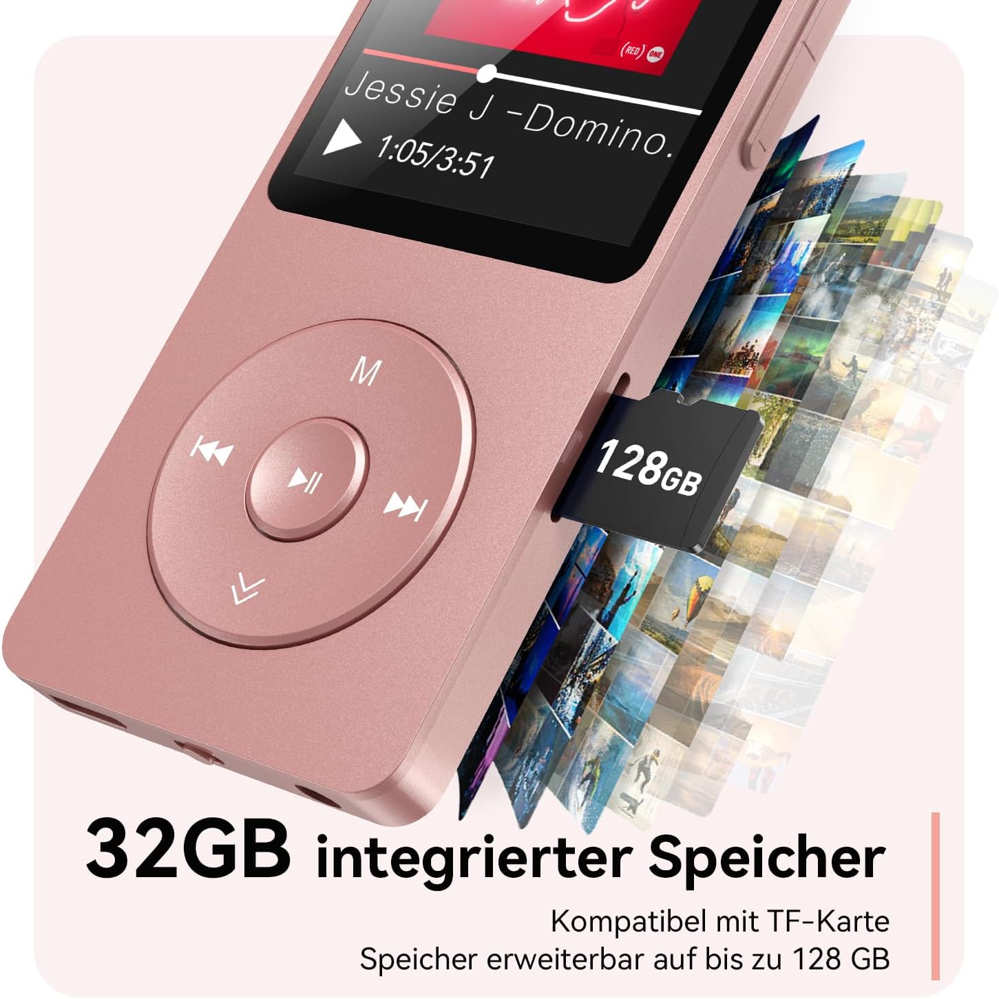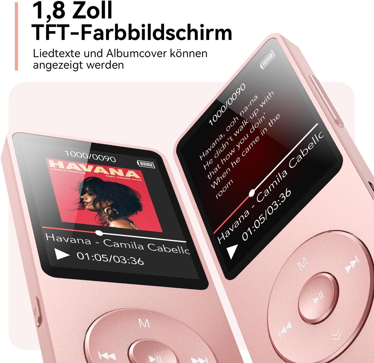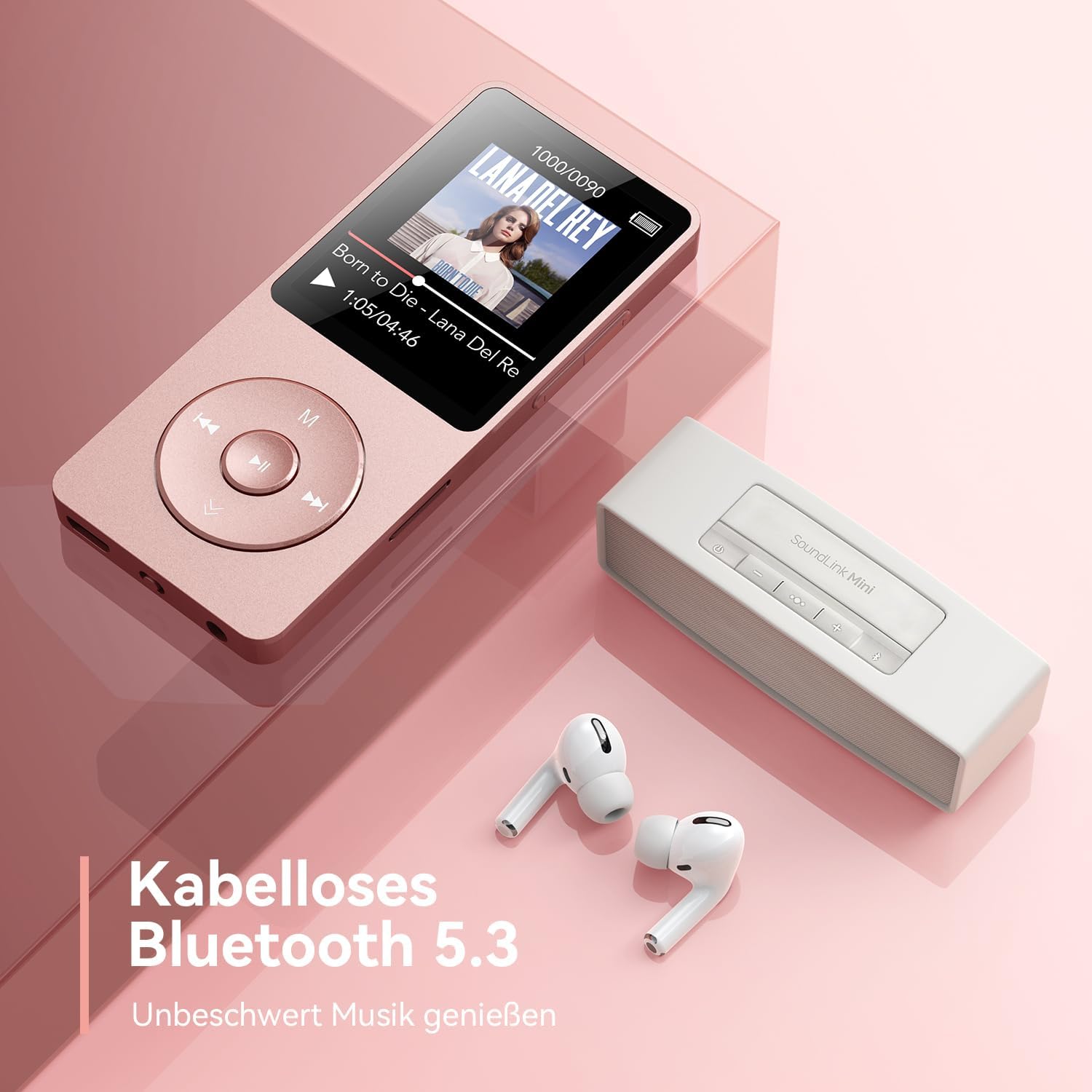 AGPTEK MP3 плейър 32GB Bluetooth 5.3, 1.8 инча 40 часа време за възпроизвеждане Цифров детски MP3 плейър с FM радио, до 128GB, (без слушалки) Розово злато