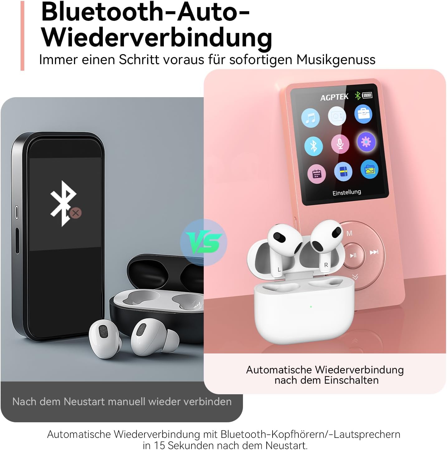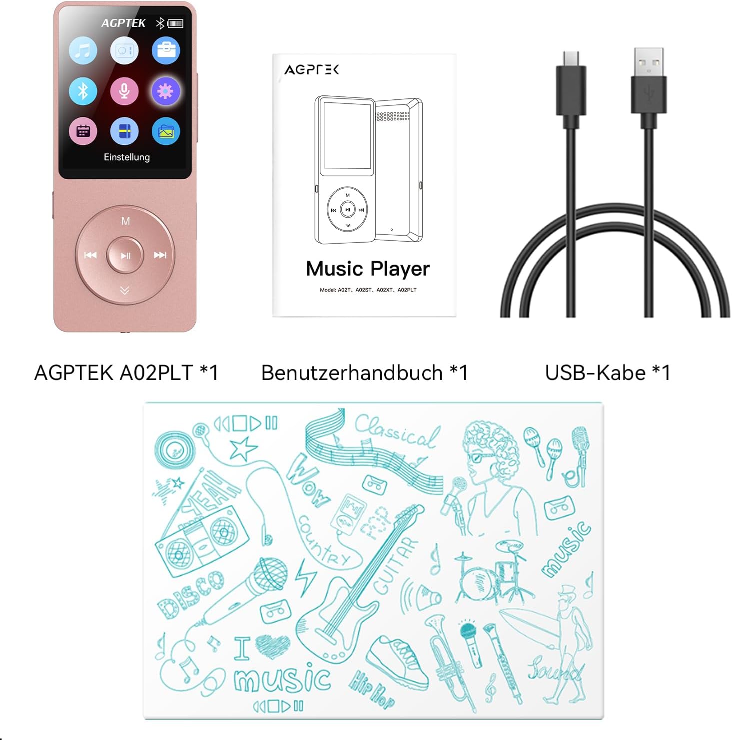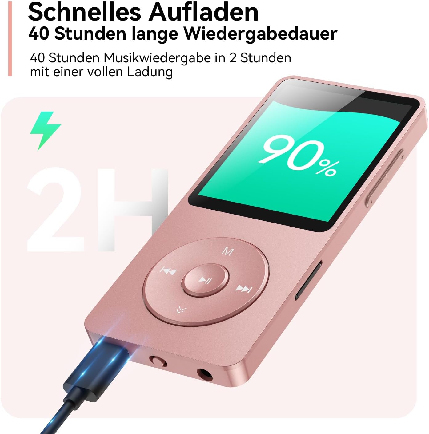 AGPTEK MP3 плейър 32GB Bluetooth 5.3, 1.8 инча 40 часа време за възпроизвеждане Цифров детски MP3 плейър с FM радио, до 128GB, (без слушалки) Розово злато
