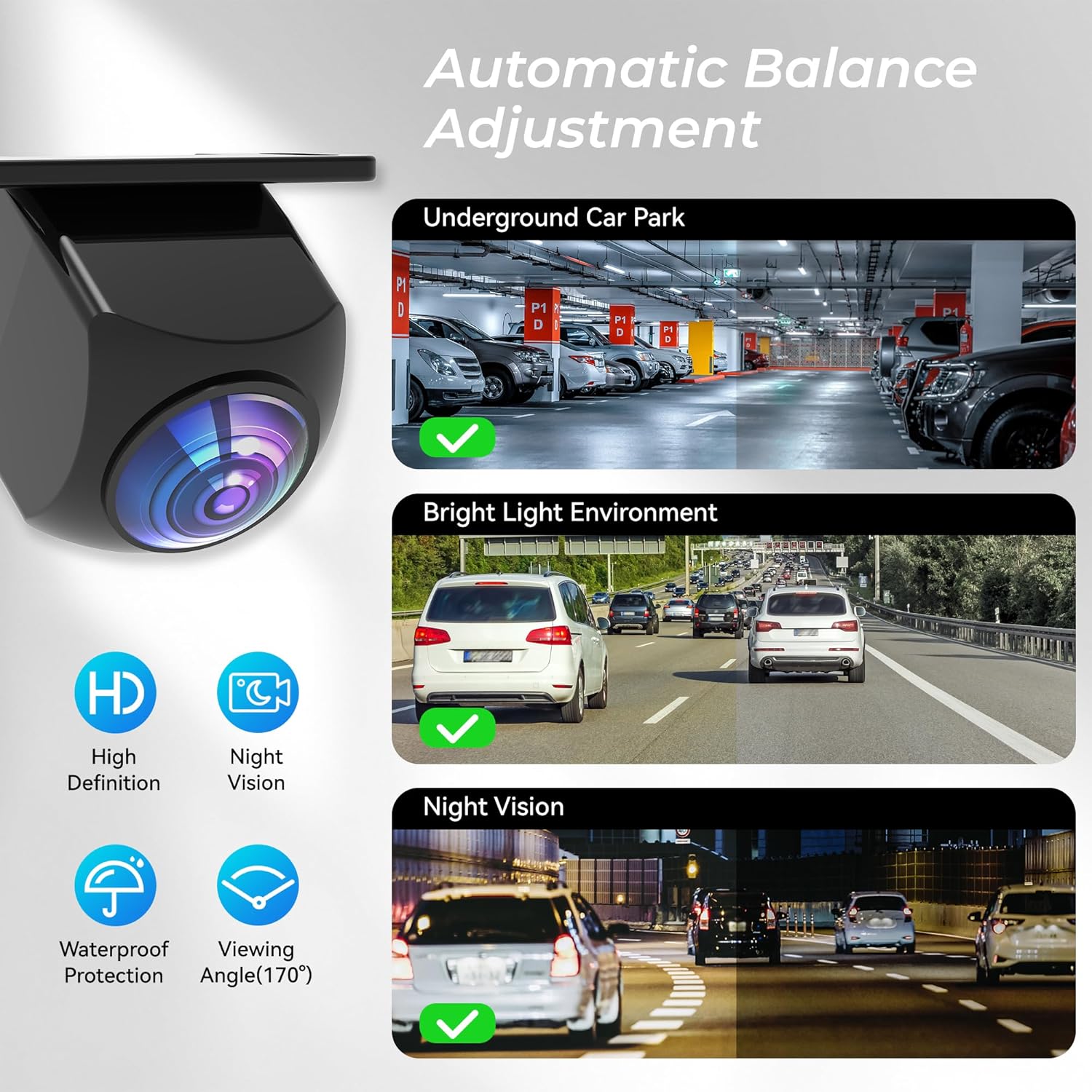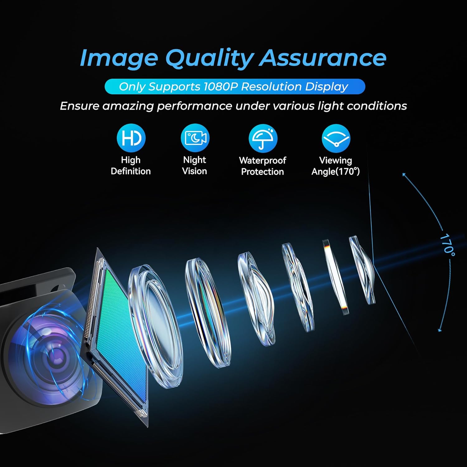 • 【170° широкоъгълен HD обектив, изработен от оптично стъкло】Обективът е основният компонент на камерата за задно виждане. HD обективът, използван в 170° широкоъгълните камери за задно виждане, се различава значително от конвенционалните обективи. Той разполага с по-голяма бленда и е технологично по-усъвършенстван. Високопрозрачното стъкло, оптиката „рибешко око“ и блендата F1.4 значително определят широкоъгълното зрително поле, максималния брой пиксели и нощното виждане на камерата за регистрационен номер.