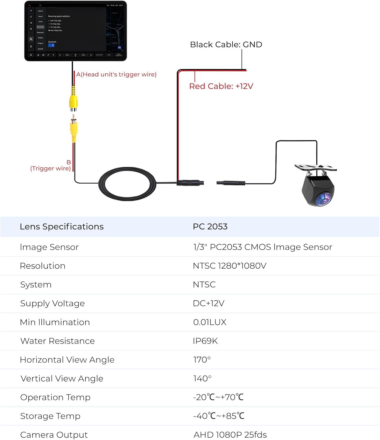 • 【Поддържа само AHD 1080p】Тази подобрена камера за заден ход поддържа изключително AHD 1080p изход. Всяка оптимизация подобрява остротата на изображението, стабилността на сигнала, водоустойчивостта, издръжливостта, монтажа и др. Нашата камера за заден ход поддържа само AHD сигнален изход за 1080p дисплей (при условие че екранът поддържа AHD 1080p; НЕ е подходяща за CVBS и AHD720p изход).