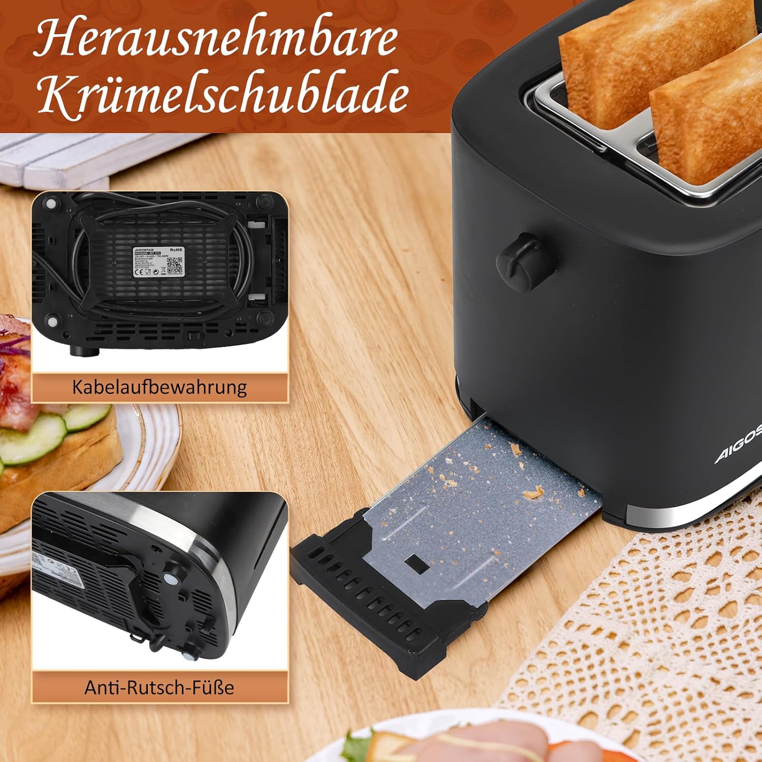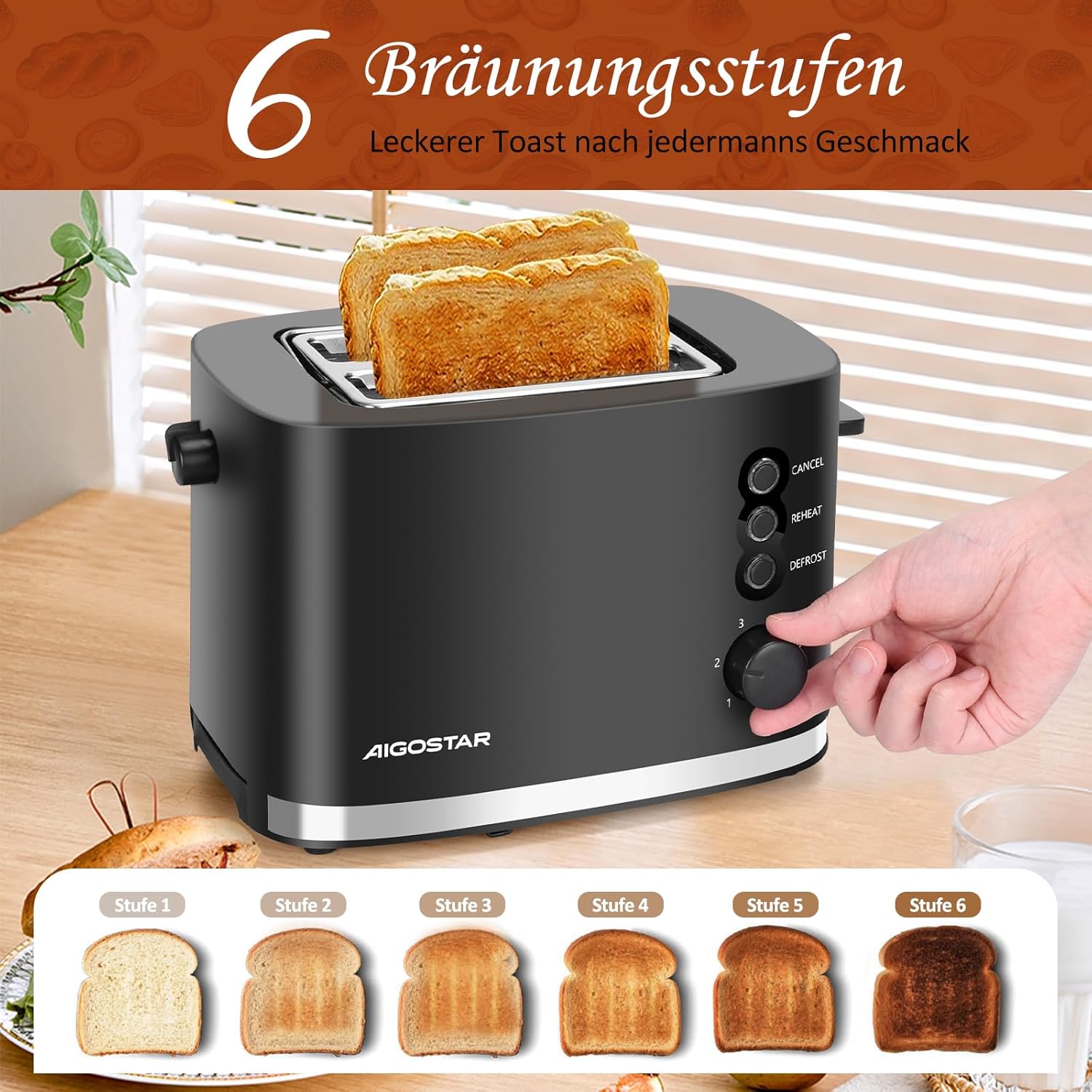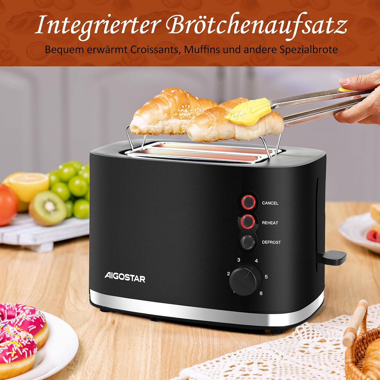 Aigostar Energy - Тостер за 2 филийки с приставка за хлебчета, изключително широки отвори за препечен хляб и центриране на хляба, 6 нива на изпичане, функции за отмяна, размразяване и претопляне, отделение за трохи, 800 W, черен