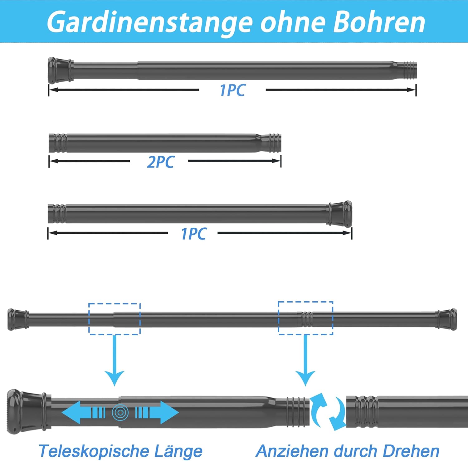 • Съдържание на опаковката и бележка: 1 x телескопичен прът 40-63 см, 2 x удължителен прът 35 см и 1 x допълнителен удължителен прът 25 см. Корниз за завеси без пробиване, моля, уверете се, че сте го монтирали в лявата фотогалерия след втората снимка и видеото за монтаж.