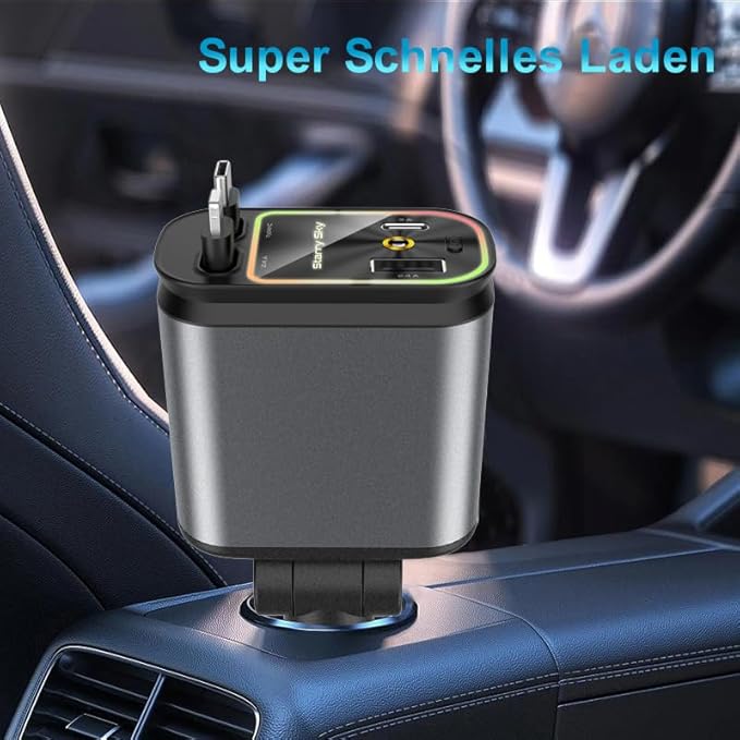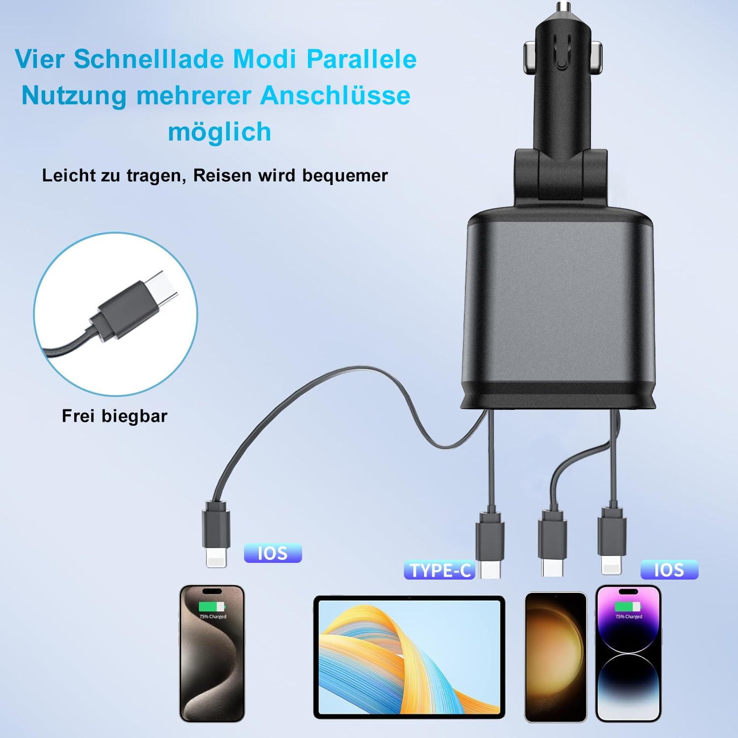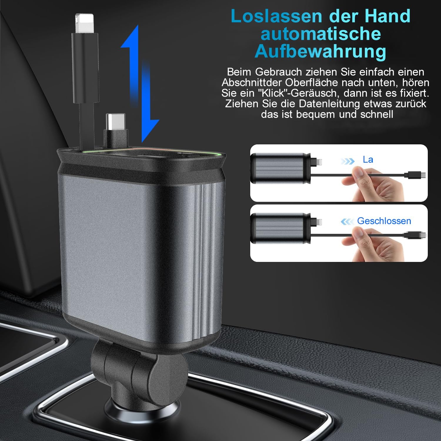 • Универсална съвместимост с превозни средства: зарядното за кола с прибиращ се кабел тип C предлага скорости на зареждане до 66 W, кабел за зареждане на Apple, както и USB и тип C портове. Зарядно устройство с поддръжка на протоколи за бързо зареждане като PD 30W, QC 3.0, AFC, MTK и FCP. Поддържа мобилни телефони, таблети, лаптопи, комутатори, за да отговори на изискванията за супер зареждане, и зарежда до 4 устройства едновременно. Това зарядно за кола е подходящо за автомобили, SUV-ове, камиони, каравани и други превозни средства.
