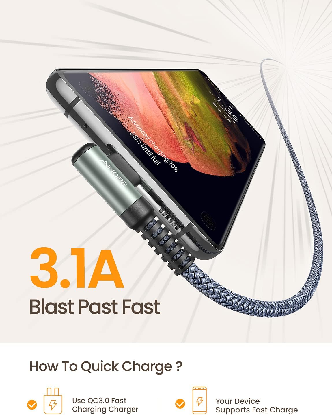 AINOPE 3.1 A USB-C кабел за бързо зареждане, правоъгълен Type-C кабел за бързо зареждане, издръжлив USB-C кабел за зареждане с найлонова оплетка, съвместим със SAMSUNG Galaxy S20/S20+/S10/S9/S8, пакет от 2 (3 м + 3 м)