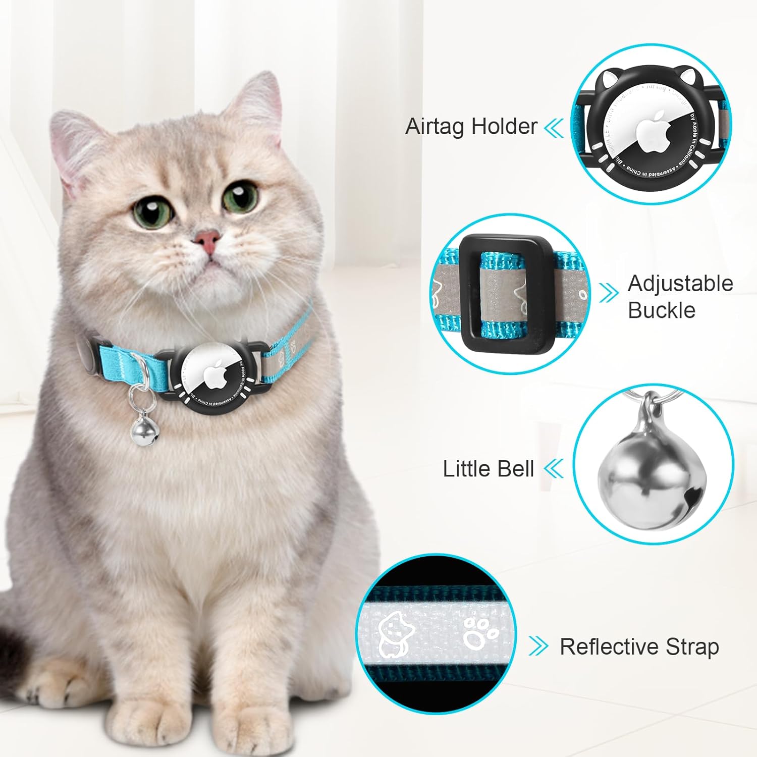 Airtag Нашийник за котки, AirTag Нашийник, Светлоотразителен за котки с предпазна закопчалка, Звънец, Котешки Нашийници с Калъф Airtag, Регулируеми за котки, Син, XS (17.5-23 см)