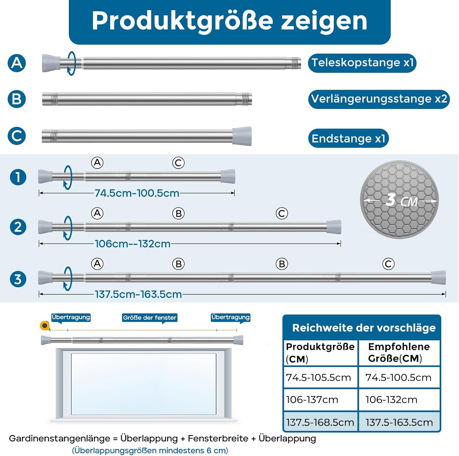 AIZESI Дръпка за душ завеса, регулируема, 86-138 см, неръждаема и неплъзгаща се, опъваща се дръпка за завеса, без пробиване, дръпки за душ за баня, кухня, сребриста