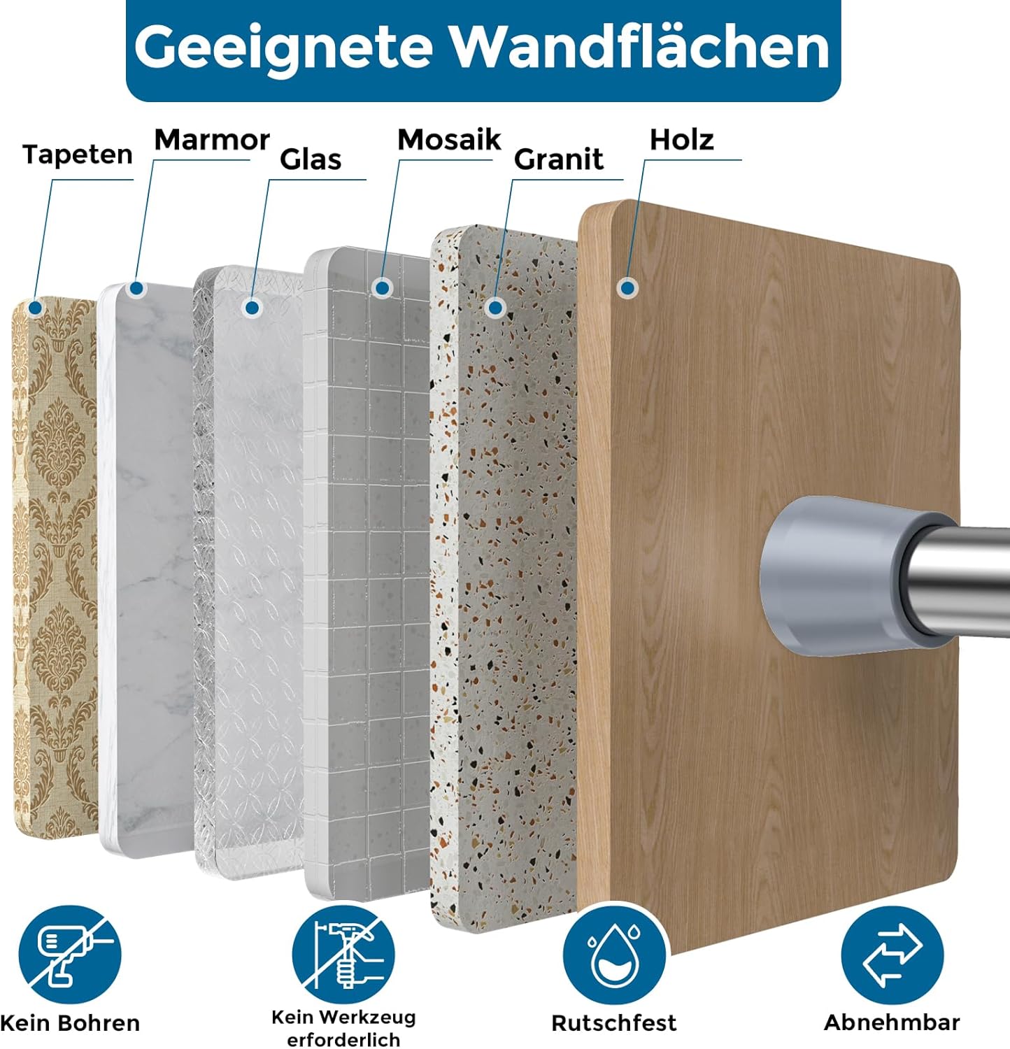 • Неплъзгаща се и устойчива на корозия: Тази стойка за душ за завеса е снабдена с фин, неплъзгащ се горен край и е изработена от висококачествен материал, който ефективно предотвратява корозията.