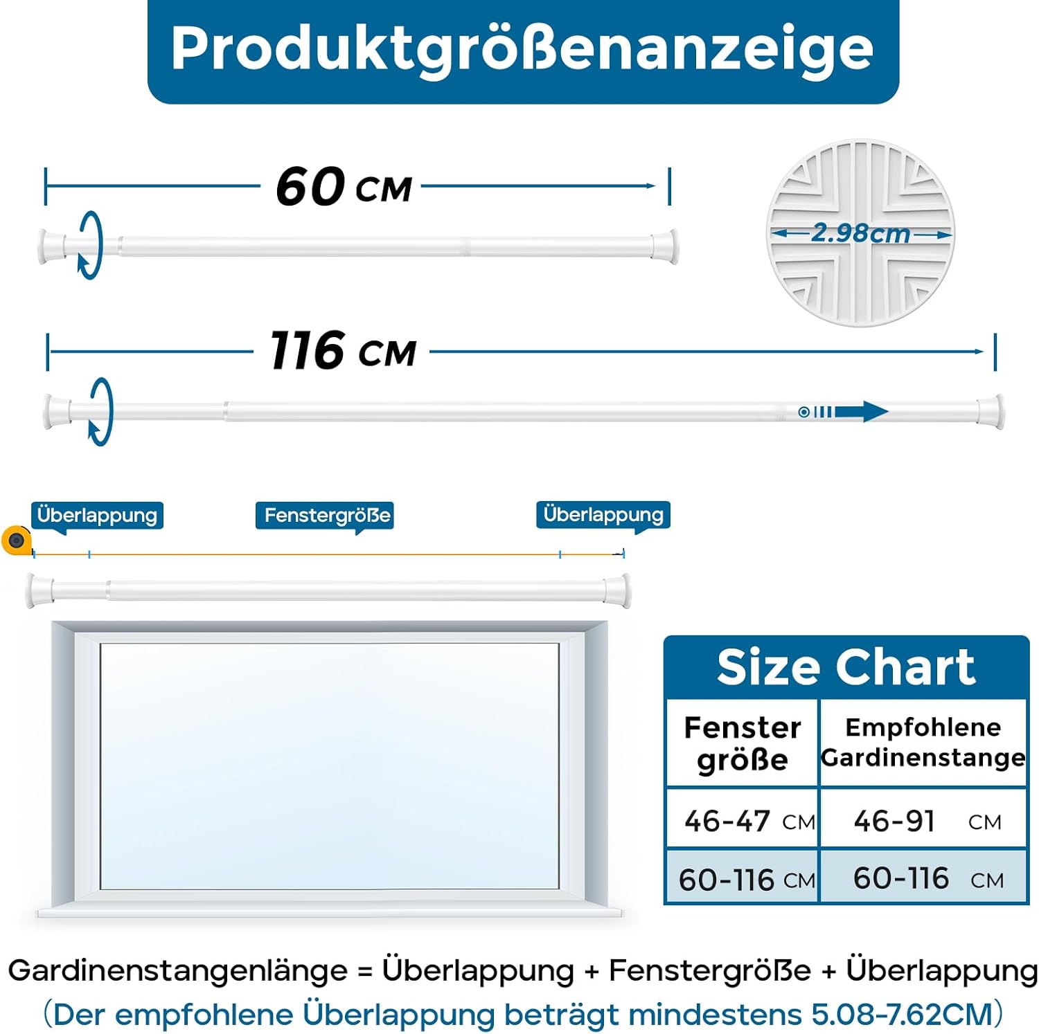 • Спецификация на пакета: Този пакет съдържа корниз за завеси без пробиване, който е гъвкаво регулируем в диапазона 60-120 см. За перфектно прилягане препоръчваме използването им в посочения диапазон 60-120 см.