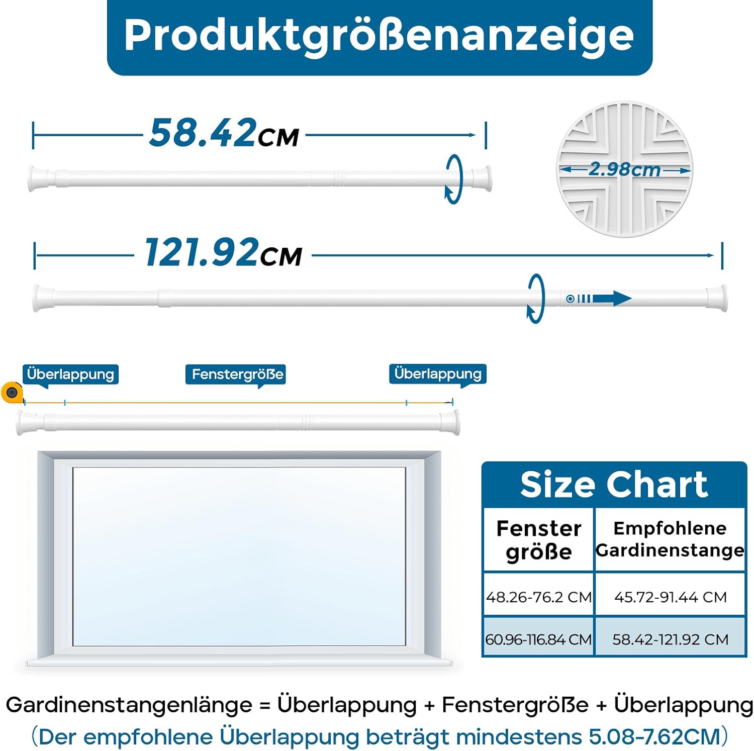 • Спецификация на пакета: Този пакет съдържа корниз за завеси без пробиване, който е гъвкаво регулируем в диапазона 60-120 см. За перфектно прилягане препоръчваме използването им в посочения диапазон 60-120 см.
