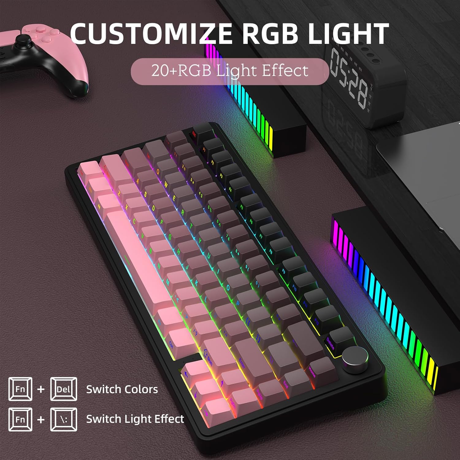 • 75% ANSI оформление и дизайн на бутоните: Възползвайте се от най-популярното 75% AINSI оформление, 82 бутона, което го прави практичен избор за работа/игри. Запазва важните клавиши със стрелки и функционални клавиши, като същевременно освобождава място на бюрото. Лесно управление с вградения контрол на силата на звука, изработен от висококачествен CNC алуминий. Натиснете бутона, за да включите светлината, и го завъртете наляво/надясно, за да регулирате силата на звука.