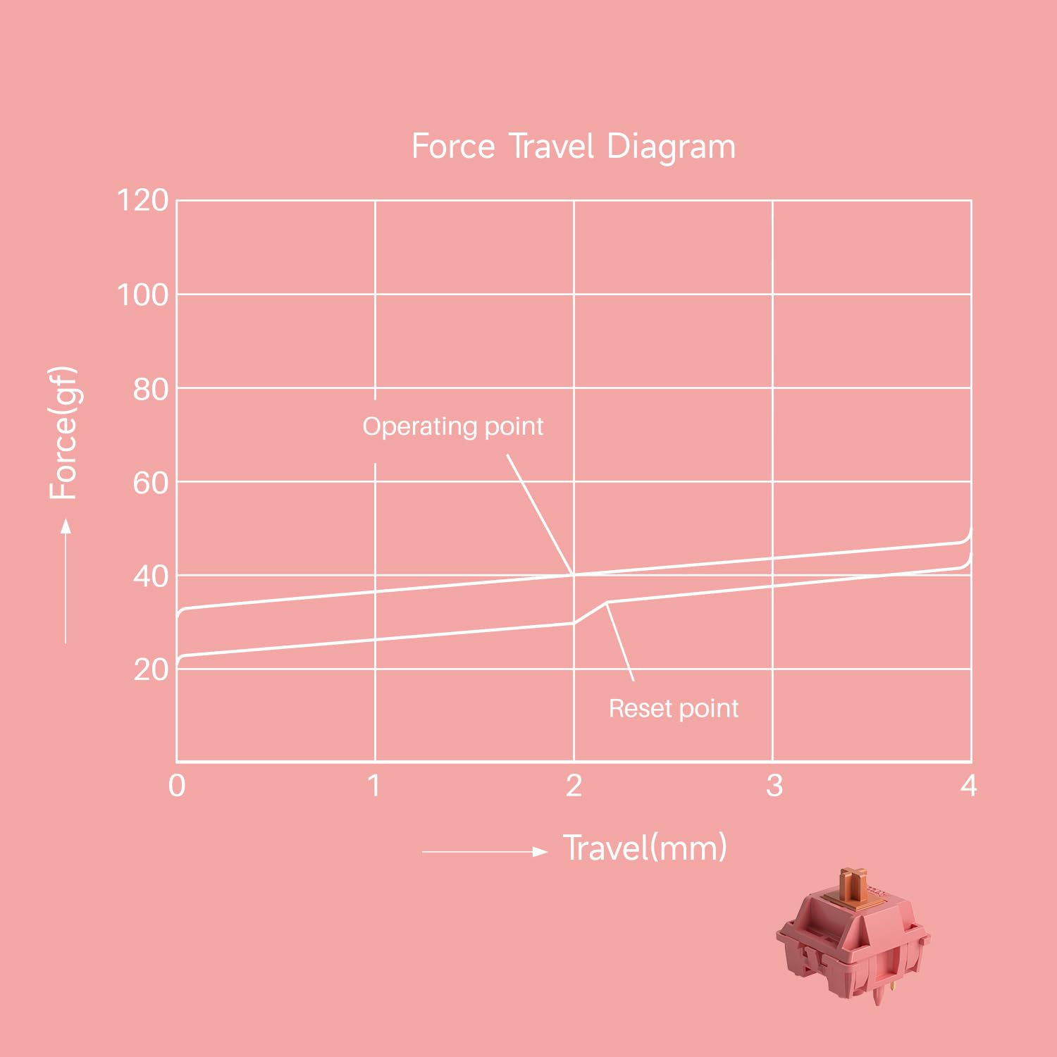 • Чист звуков профил: Превключвателят поддържа класическия и носталгичен пълен ход от 4,0 мм и осигурява характерен дълбок звук, както и приятно тракащ звуков профил върху повечето материали за клавиатури с тънък слой фабрично смазване.