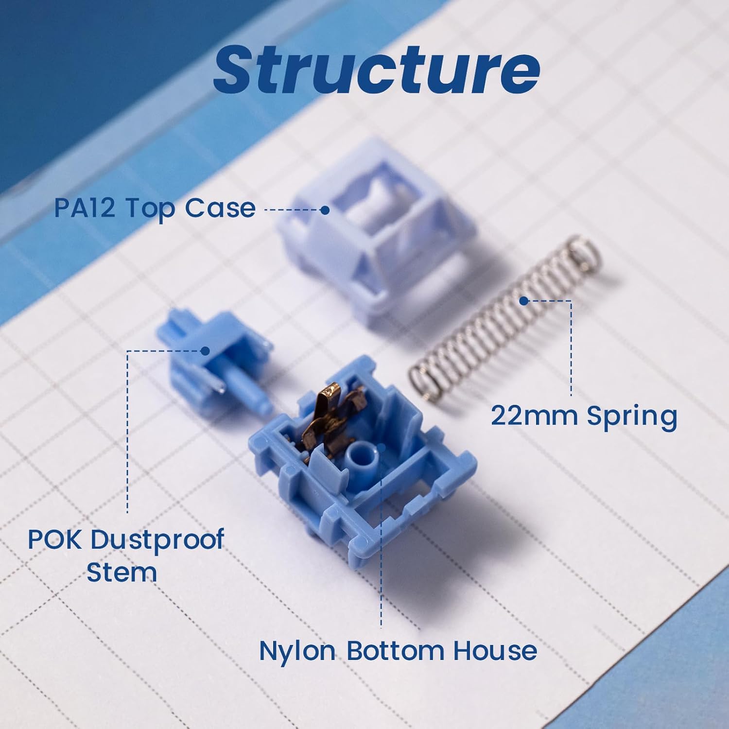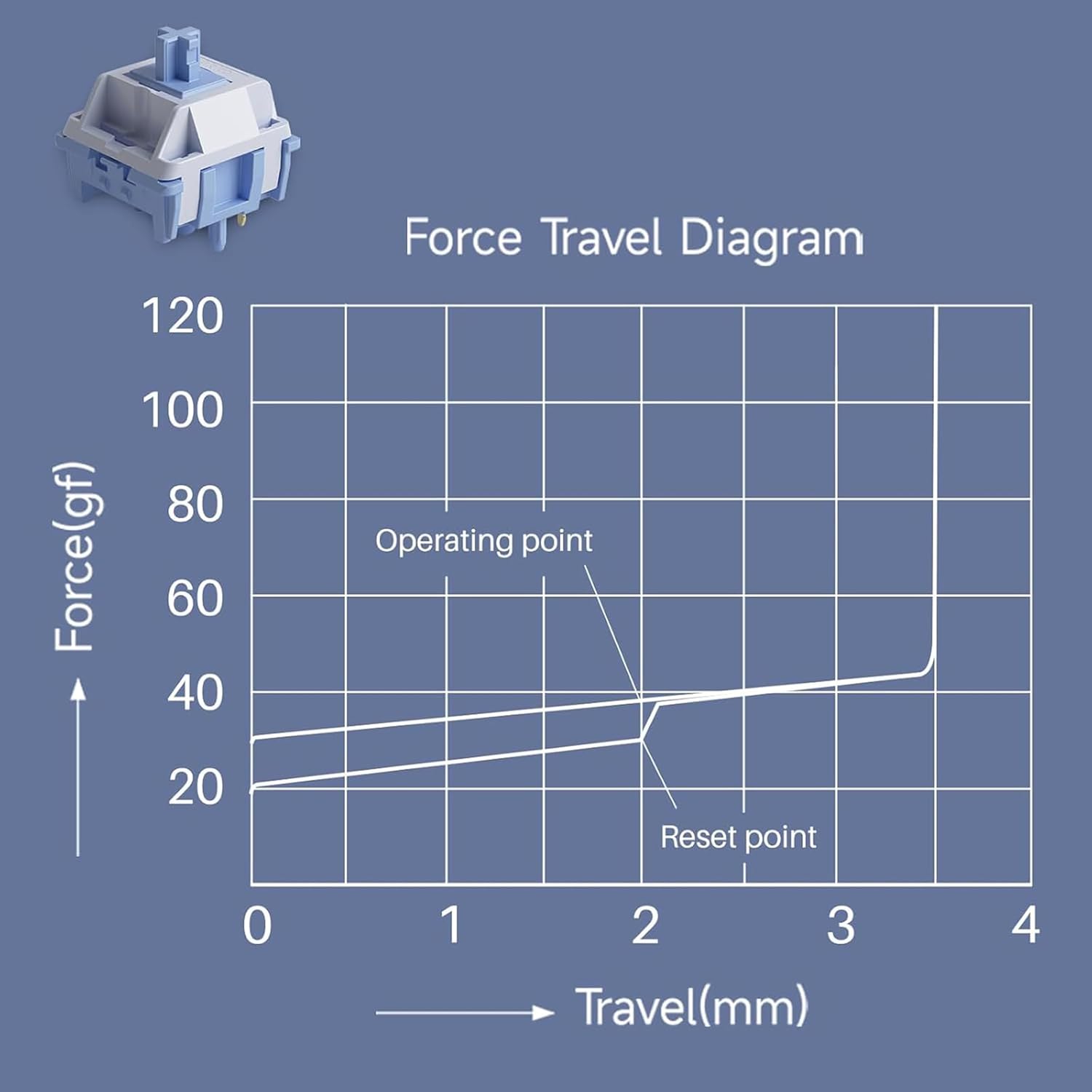 • Чист звуков профил: Превключвателят поддържа класическия и носталгичен пълен ход от 4,0 мм и осигурява характерен дълбок звук, както и приятно тракащ звуков профил върху повечето материали за клавиатури с тънък слой фабрично смазване.