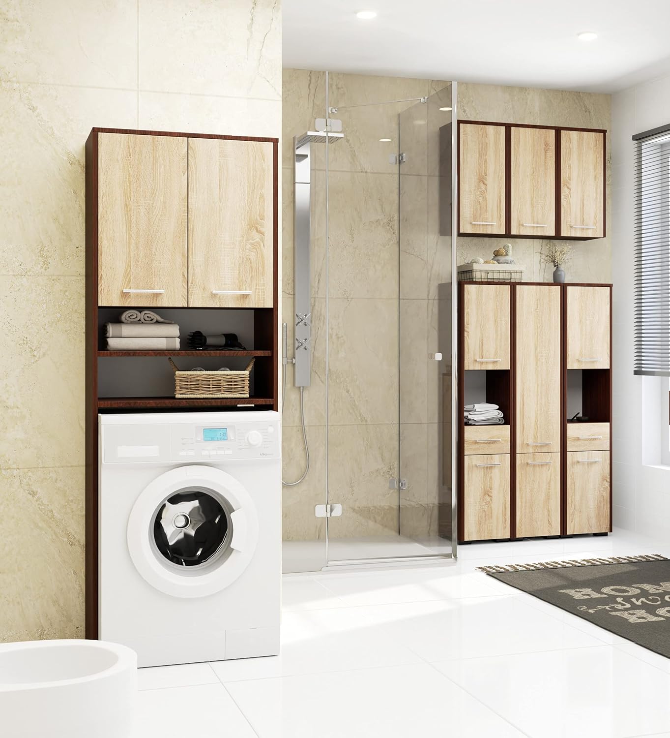• Оптимално използване на пространството: Практичният шкаф за пералня в елегантен, модерен стил ви помага да оползотворите максимално пространството около пералнята в банята или в перално помещение. Това ви осигурява допълнително място за съхранение.