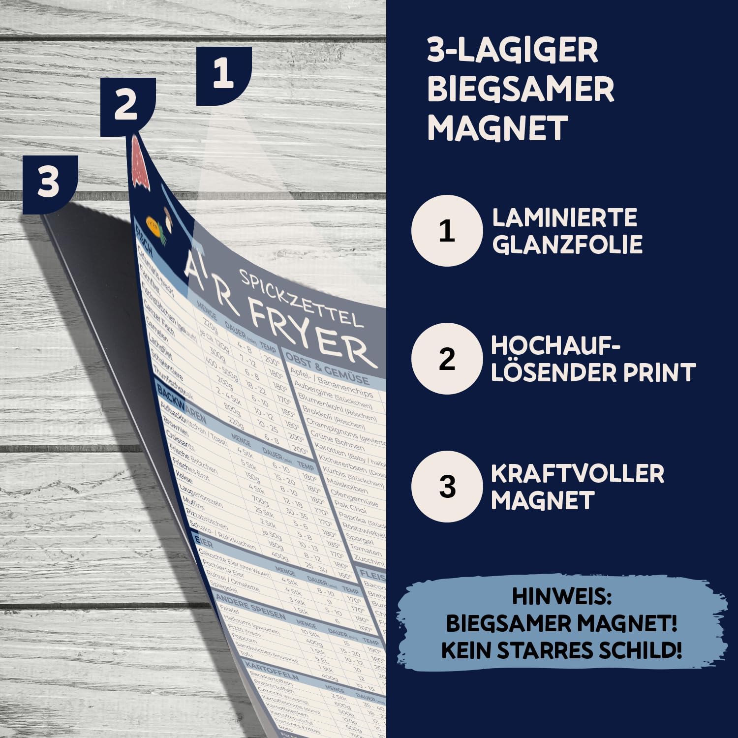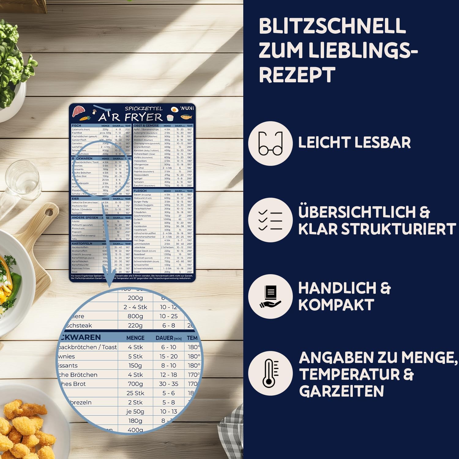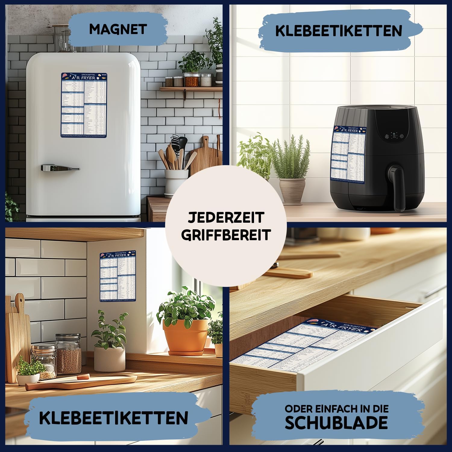 • Винаги под ръка: благодарение на включения магнит и вендуза, шпаргалката може лесно и компактно да се закрепи към стената в кухнята, хладилника или директно към фритюрника и е съвместима с често срещани устройства като Ninja Airfryer, Cosori Airfryer, Philips Airfryer.