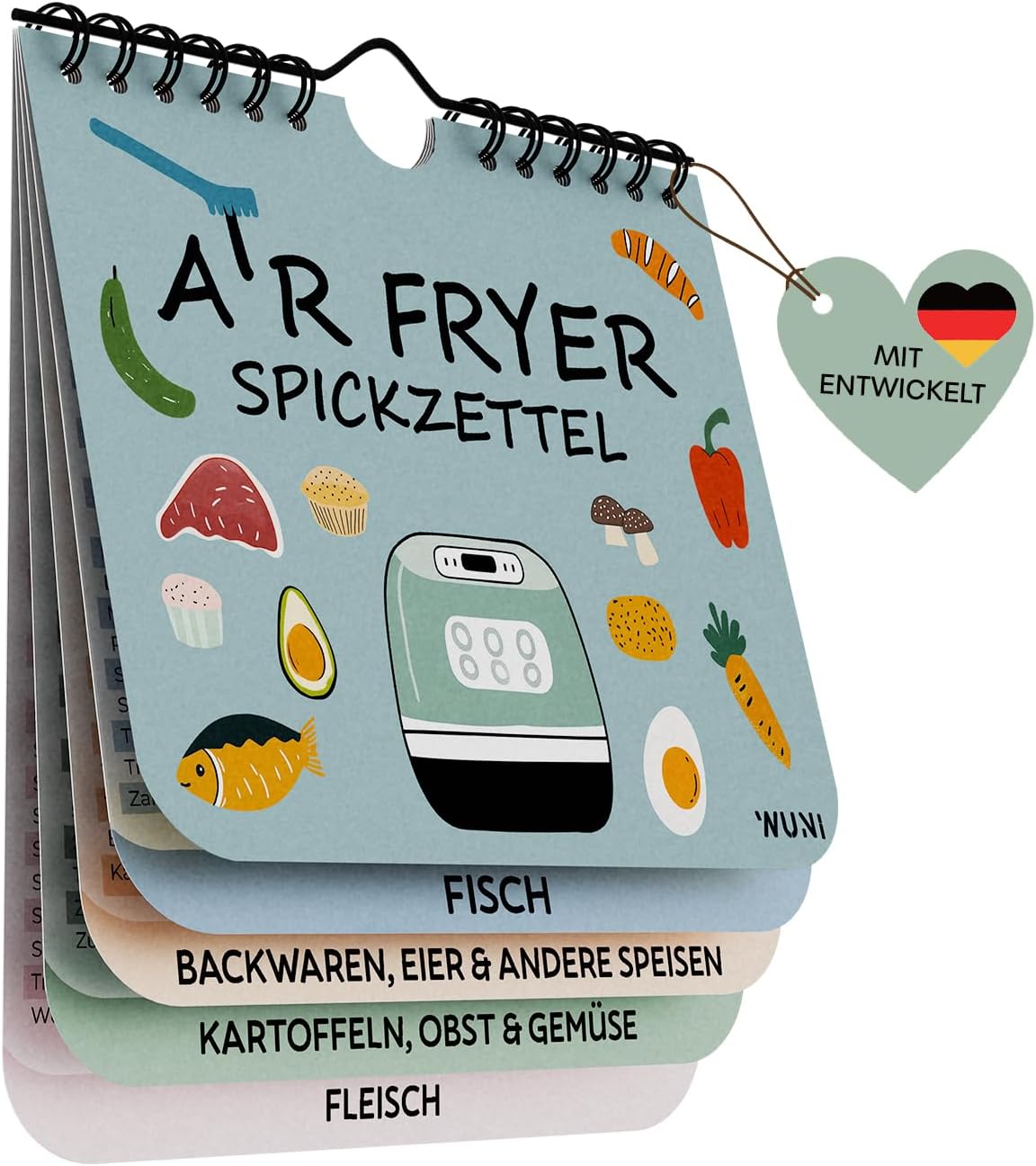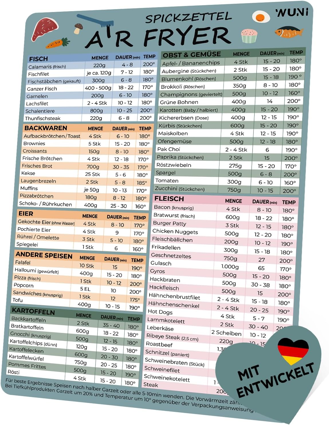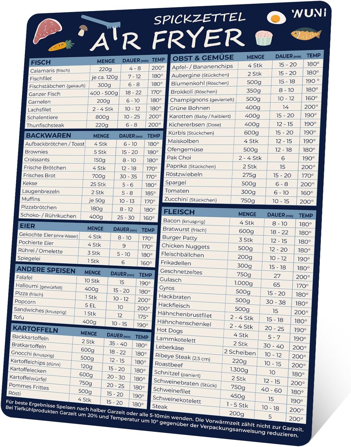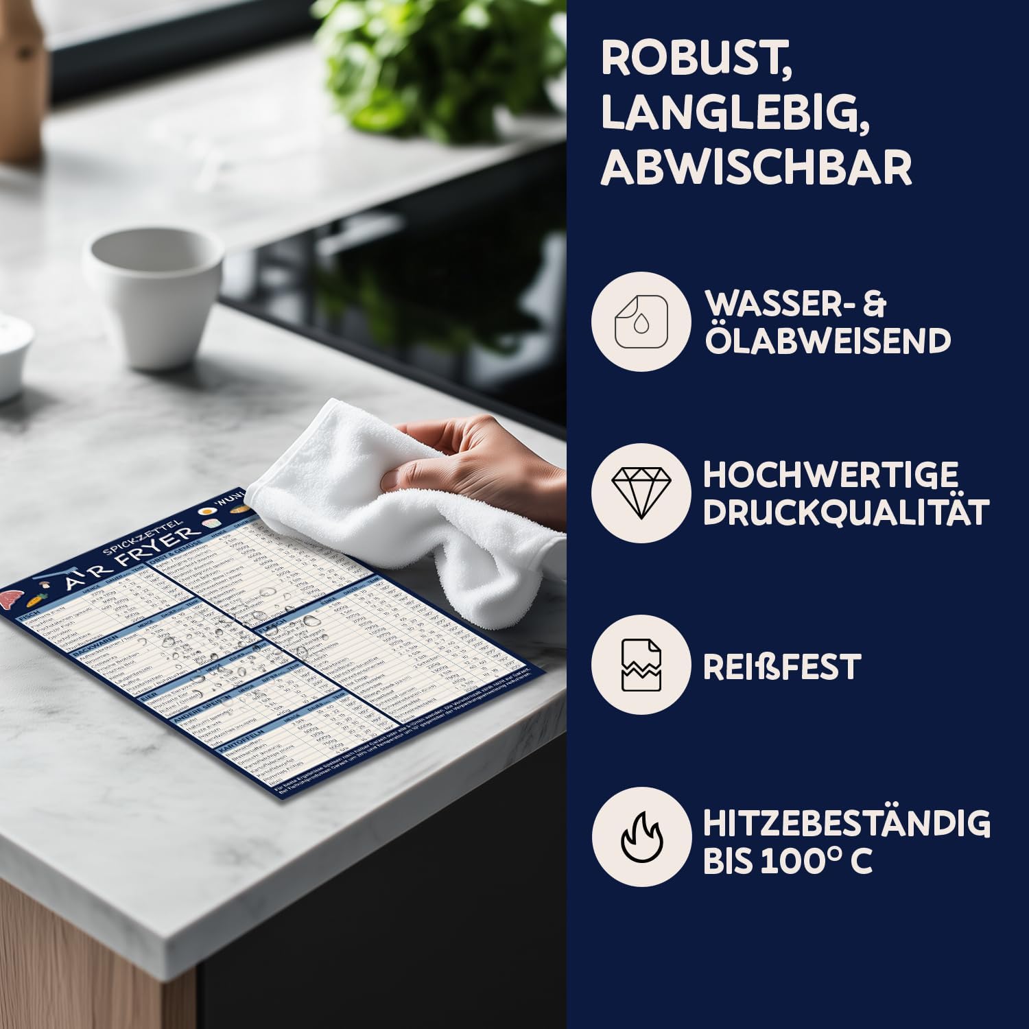 • Винаги под ръка: благодарение на включения магнит и вендуза, шпаргалката може лесно и компактно да се закрепи към стената в кухнята, хладилника или директно към фритюрника и е съвместима с често срещани устройства като Ninja Airfryer, Cosori Airfryer, Philips Airfryer.