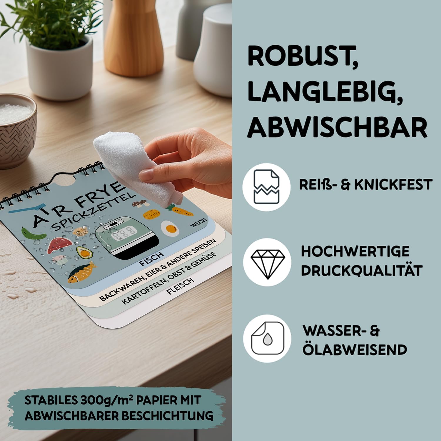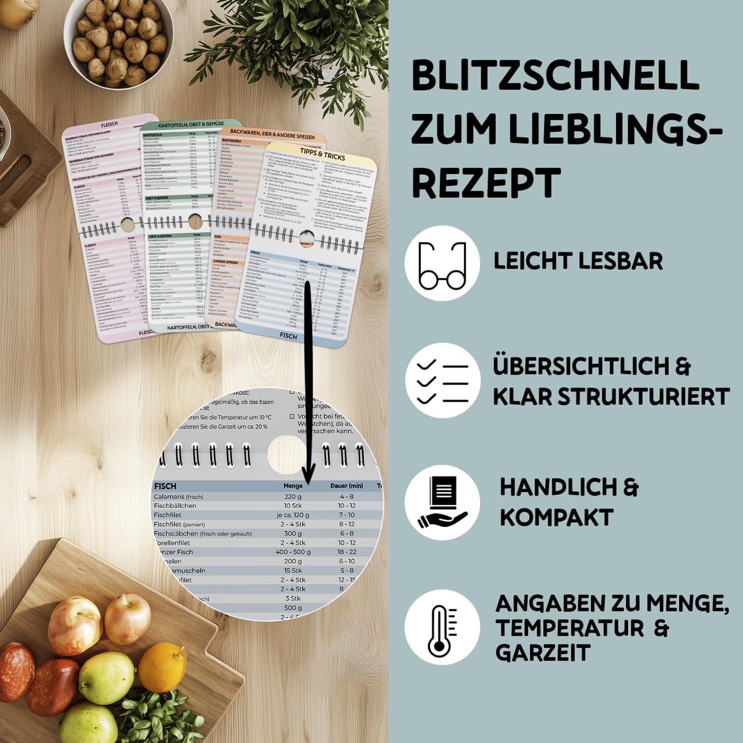 • Винаги под ръка: благодарение на включения магнит и вендуза, шпаргалката може лесно и компактно да се закрепи към стената в кухнята, хладилника или директно към фритюрника и е съвместима с често срещани устройства като Ninja Airfryer, Cosori Airfryer, Philips Airfryer.