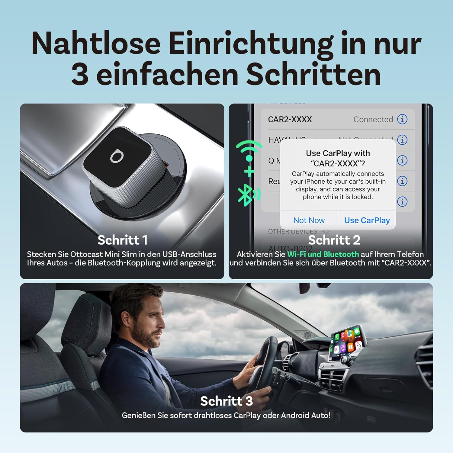 • [Спрете кабелите, почувствайте свободата!] Кажете сбогом на хаоса от кабели в колата си завинаги! С Ottocast Mini Slim ще се насладите на безпроблемна безжична връзка с аудио системата на вашия автомобил – напълно без кабели, просто чиста свобода. Независимо дали сте на път за пътуване или за работа: Очаквайте чисто и безпроблемно пътуване – всеки път.