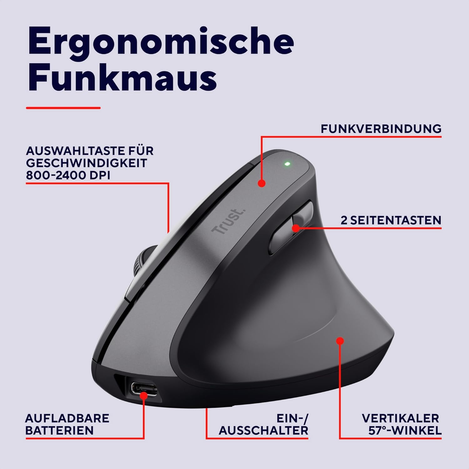 Акумулаторна вертикална мишка Trust Yuno, безжична ергономична мишка 2.4GHz, предотвратяване на деформация на ръката/тенис лакътя (RSI синдром), 800-2400 DPI, 70% рециклирана пластмаса, за компютър, лаптоп, Mac - черна
