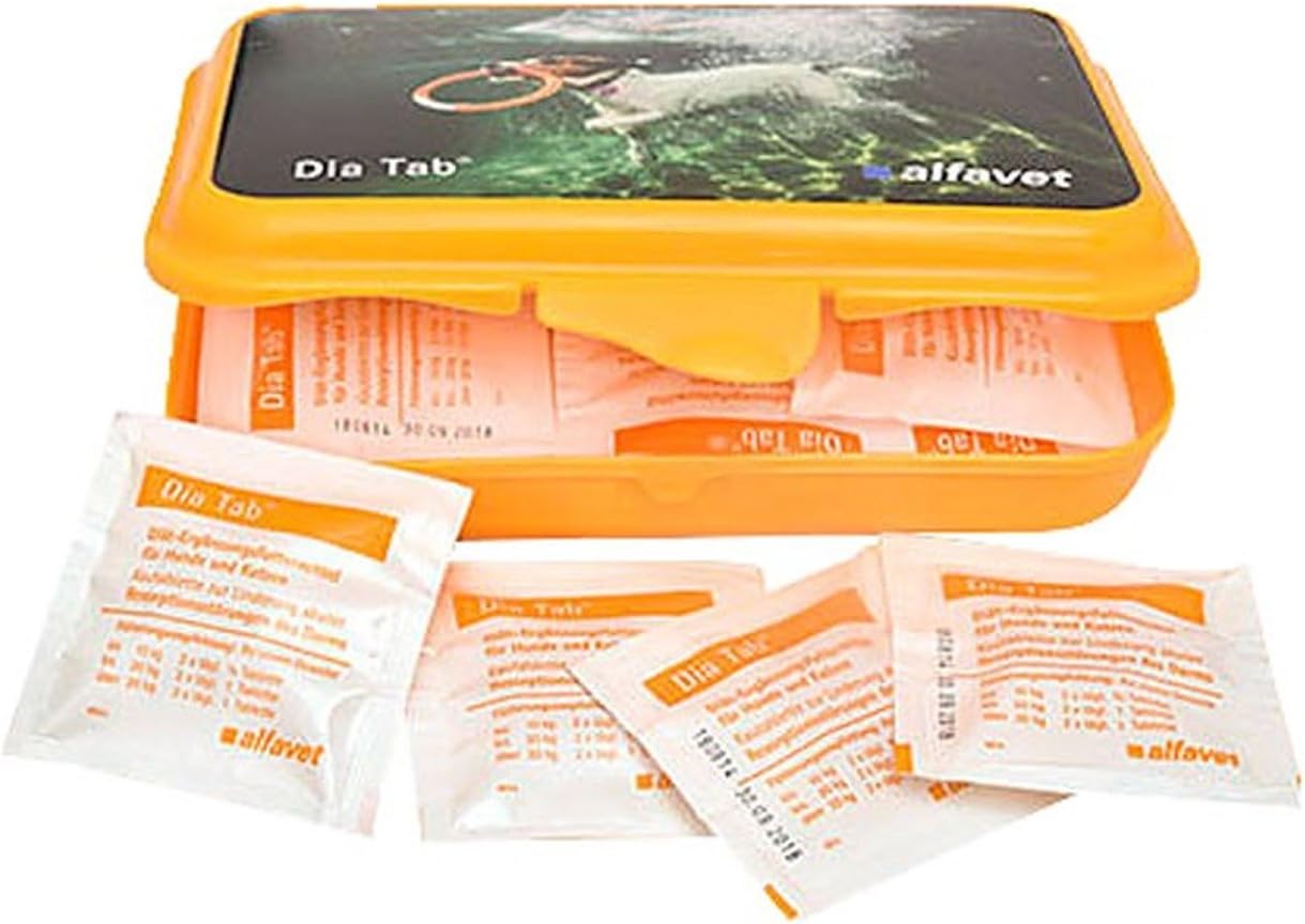 Dia Tab от Alfavet - индивидуално опаковани, доставяни в практична аптечка за пътуване! Дъвчащи таблетки за облекчаване на остри нарушения на чревната абсорбция по време на и след остра диария. Най-добър до 8/2018! Предлагаме Dia Tab и в икономична опаковка от 30 таблетки! Dia Tab съдържа балансиран състав от натурални съставки за регулиране на нарушените храносмилателни процеси. Основни хранителни характеристики: Високо съдържание на електролити, лесно смилаеми съставки. Съдържа ориз и декстроза като лесно смилаеми съставки. Състав: Птичи дроб, сушени плодови люспи (ябълка, лимон) 11,9%, декстроза, царевично нишесте, оризово брашно, сушени яйчни продукти, натриев хлорид, морковени люспи 3%, натрошен ориз, ленено брашно, бирена мая, женско биле 0,3%, боровинки 0,3%, семена от копър 0,3%, листа от къпина 0,3%, семена от сминдух 0,3%, калиев хлорид. Аналитични съставки: Суров протеин 19,9%, сурови фибри 7,2%, сурови масла и мазнини 6%, сурова пепел 11%, натрий 1,33%, калий 0,66%. Добавки на кг: Препоръка за хранене: Дъвчаща таблетка за еднократно приложение или за хранене с храна. При и след остра диария: За деца с тегло до 10 кг: 1/2 дъвчаща таблетка два пъти дневно; за деца с тегло > 10-20 кг: 1 дъвчаща таблетка два пъти дневно; за деца с тегло над 20 кг: 1 дъвчаща таблетка три пъти дневно.