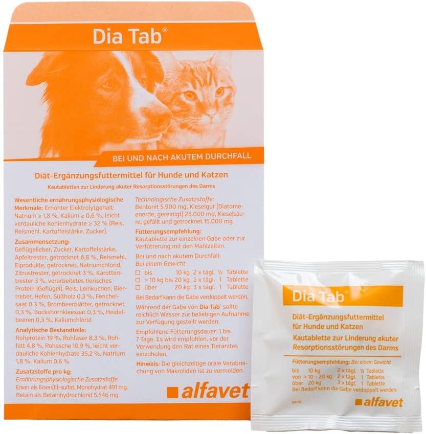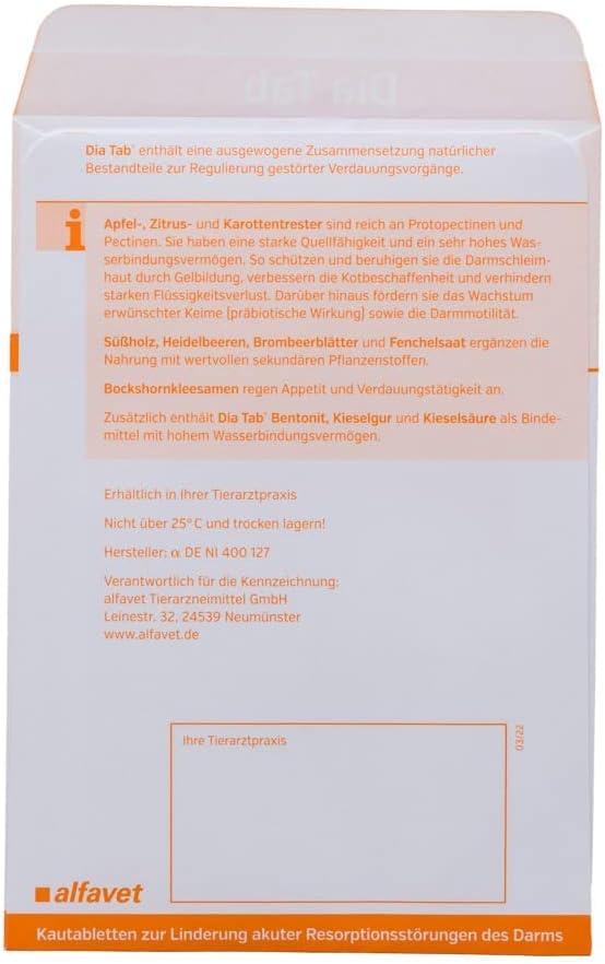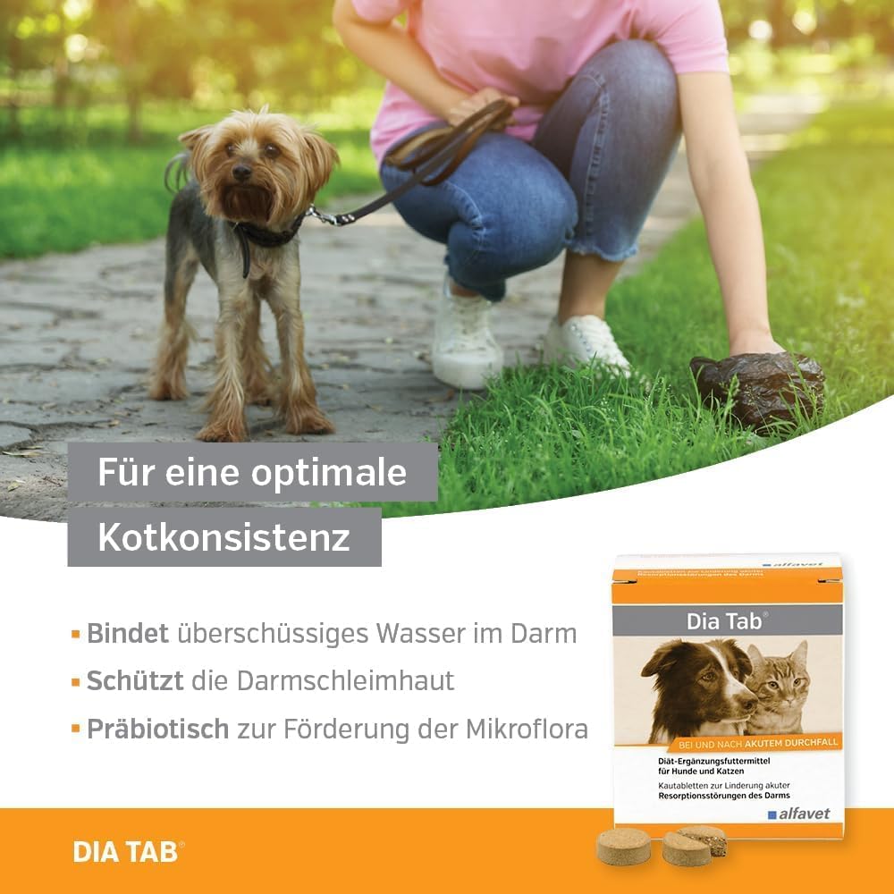 Dia Tab е хранителна добавка за кучета и котки. Тези дъвчащи таблетки могат да помогнат за облекчаване на острата чревна малабсорбция. Плодовете и морковите са богати на протопектини и пектини, които имат висок капацитет на набъбване и много висок капацитет за свързване на вода. Това помага за защита и успокояване на чревната лигавица чрез образуване на гел, подобрява консистенцията на изпражненията и предотвратява прекомерната загуба на течности. Освен това, те могат да насърчат растежа на полезни бактерии (пребиотичен ефект) и да подобрят чревната подвижност. Сладник, боровинки, листа от къпина и семена от копър допълват диетата с ценни фитохимикали. Семената от сминдух могат да помогнат за стимулиране на апетита и храносмилането. Dia Tab съдържа също бентонит, диатомит и силициева киселина като свързващи агенти с висок капацитет за свързване на вода. Dia Tab съдържа балансиран състав от естествени съставки, които могат да помогнат за регулиране на храносмилателните нарушения. Диарията при кучета и котки е често срещана по време на периоди на стрес. Недохранването също може да доведе до диария при кучета и котки.