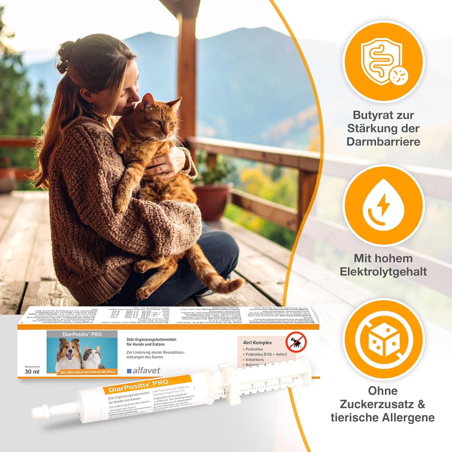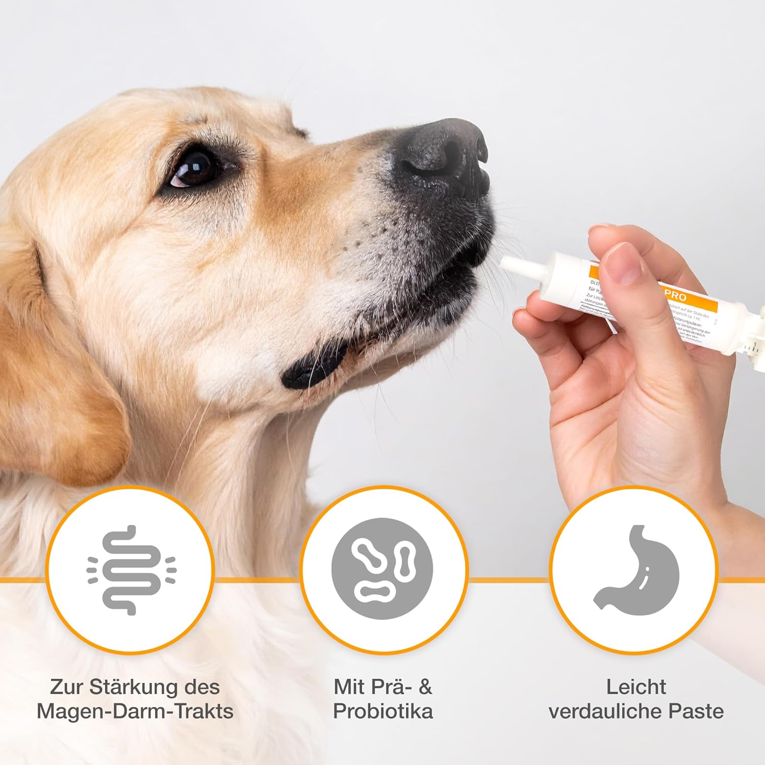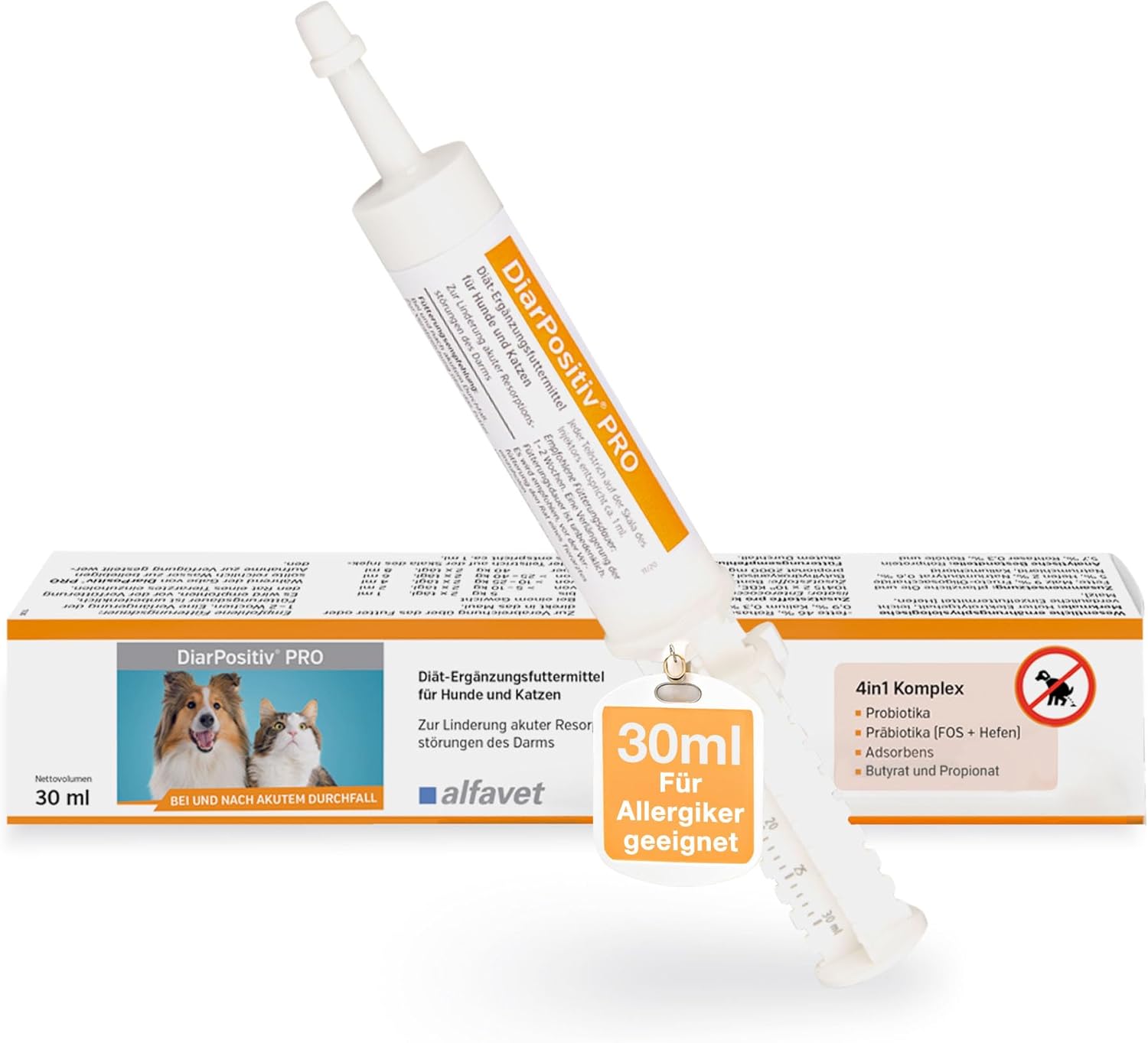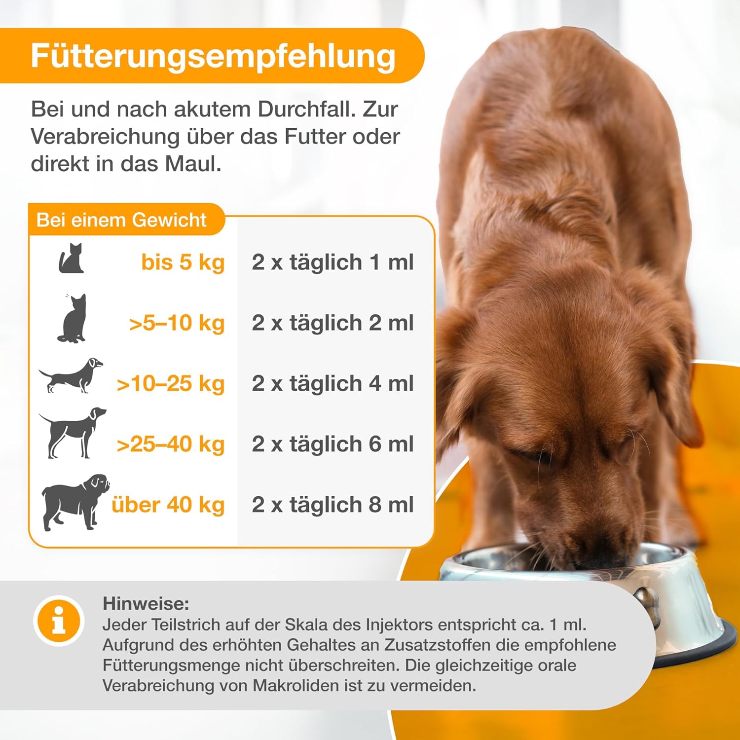 За употреба по време на и след остра диария. Прилагайте чрез храна или директно в устата. За животни с тегло до 5 kg: 1 ml два пъти дневно; за животни с тегло >5–10 kg: 2 ml два пъти дневно; за животни с тегло >10–25 kg: 4 ml два пъти дневно; за животни с тегло >25–40 kg: 6 ml два пъти дневно; за животни с тегло над 40 kg: 8 ml два пъти дневно. Всяка деления на скалата на инжектора съответстват на приблизително 1 ml.