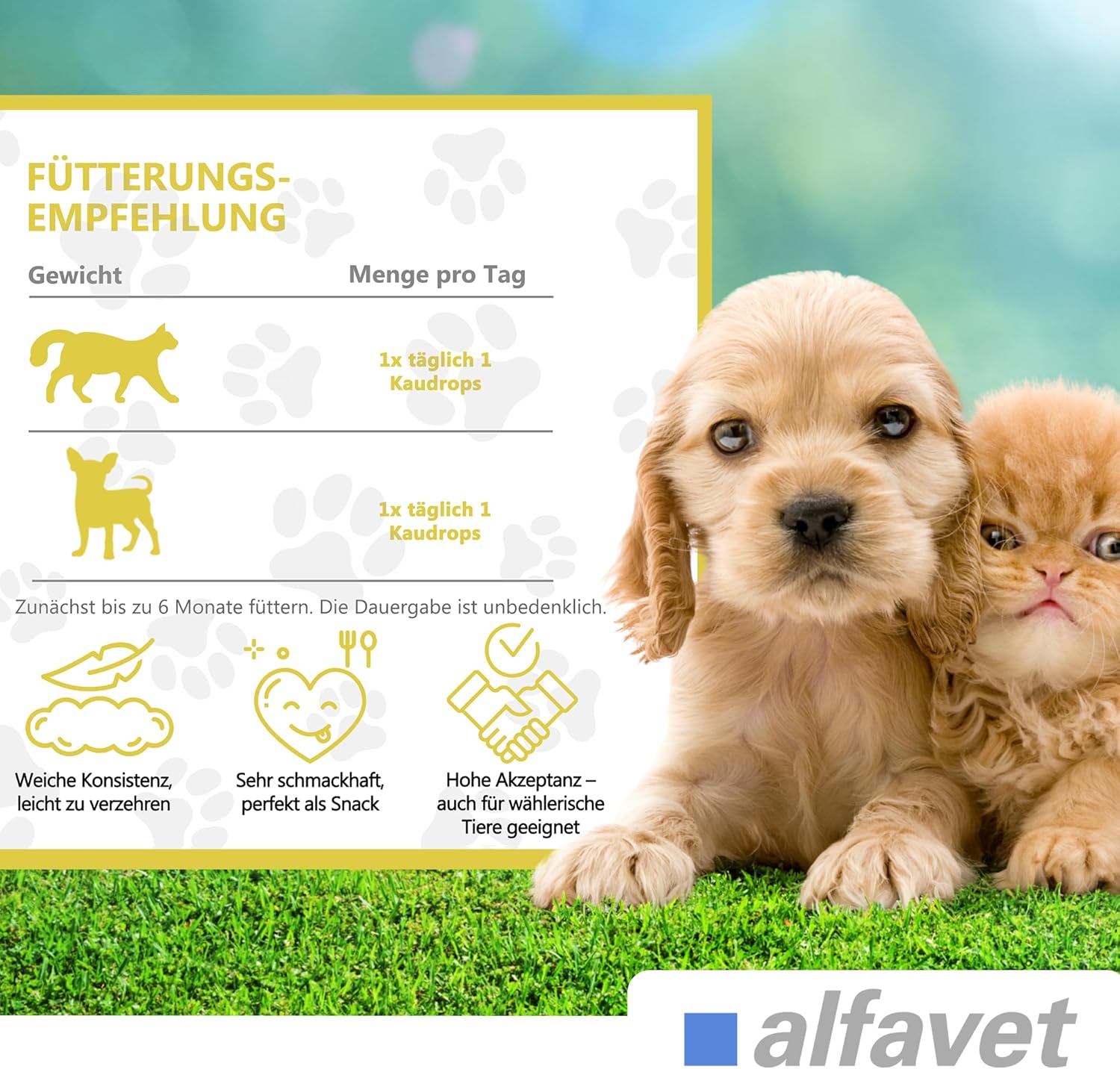 До 5 кг телесно тегло: 1 таблетка дневно; > 5 – 10 кг телесно тегло: 2 таблетки дневно