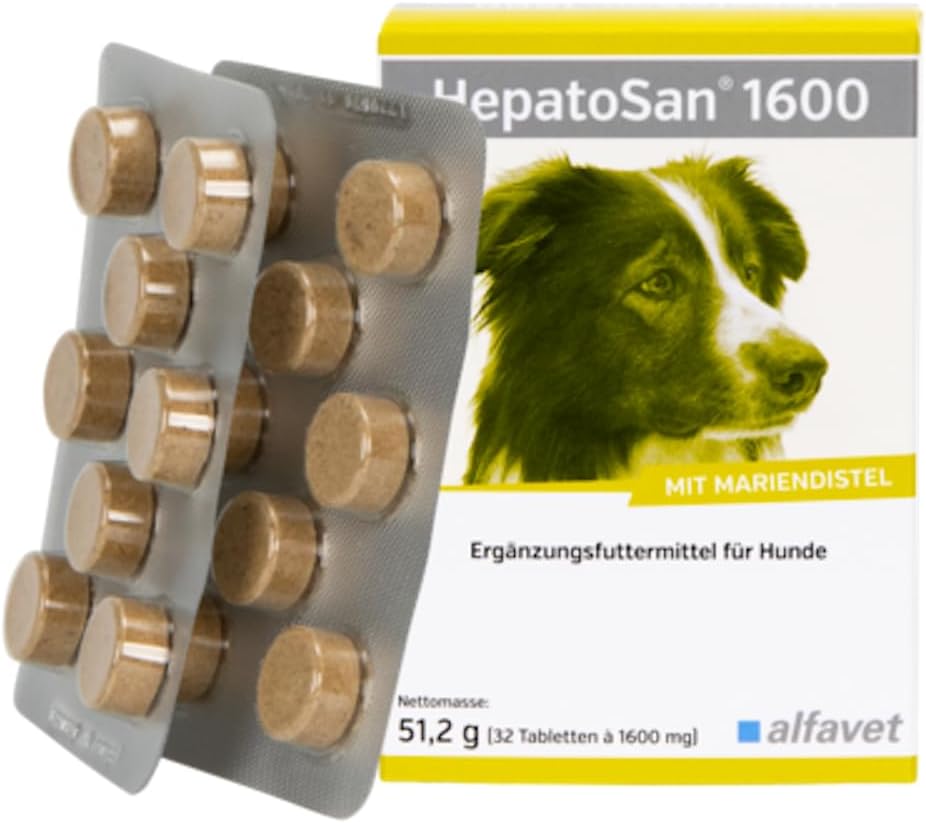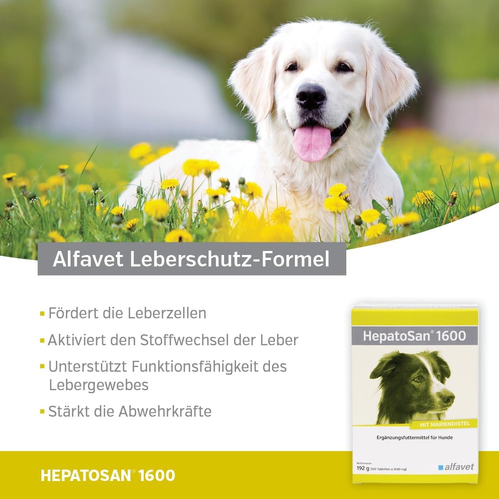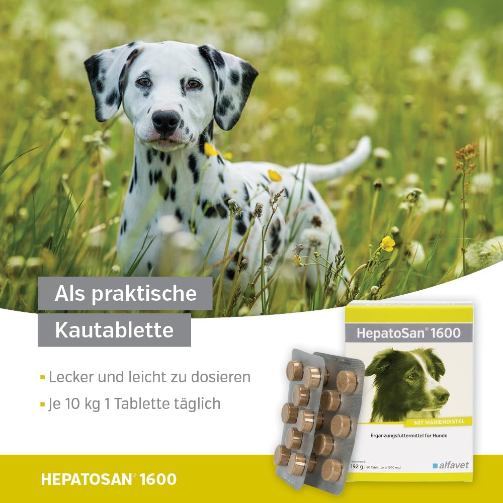 HepatoSan® 1600 (за кучета): 1 таблетка дневно на 10 кг телесно тегло. Дозата може да се удвои, ако е необходимо през първите 1-2 седмици.