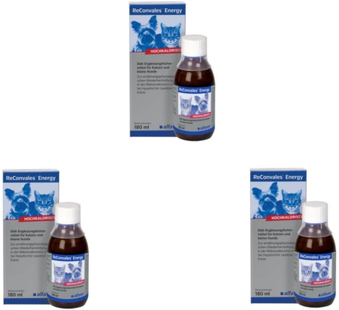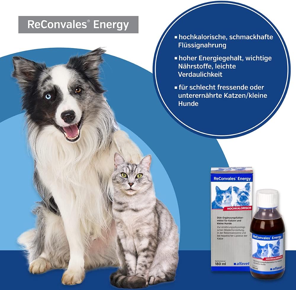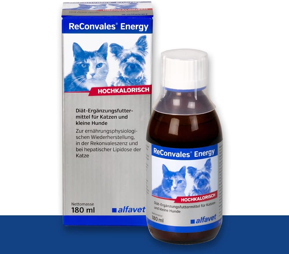 Хранителна добавка: ReConvales Energy е предназначена за котки и малки кучета за хранително възстановяване, реконвалесценция и чернодробна липидоза при котки. Хранителни свойства: ReConvales Energy има високо енергийно съдържание, висока концентрация на основни хранителни вещества и лесно смилаеми съставки. Пълноценна храна – когато се храни изключително с вода, дневната доза е недостатъчна, за да задоволи нуждите на животното от течности; следователно, трябва да се осигурява допълнителна вода. Прилагането на Alfavet ReConvales Energy чрез сонди за хранене трябва да се извършва само под ветеринарен надзор. Ветеринарен съвет: Консултирайте се с ветеринарен лекар, преди да използвате храната или да удължите срока ѝ на годност.