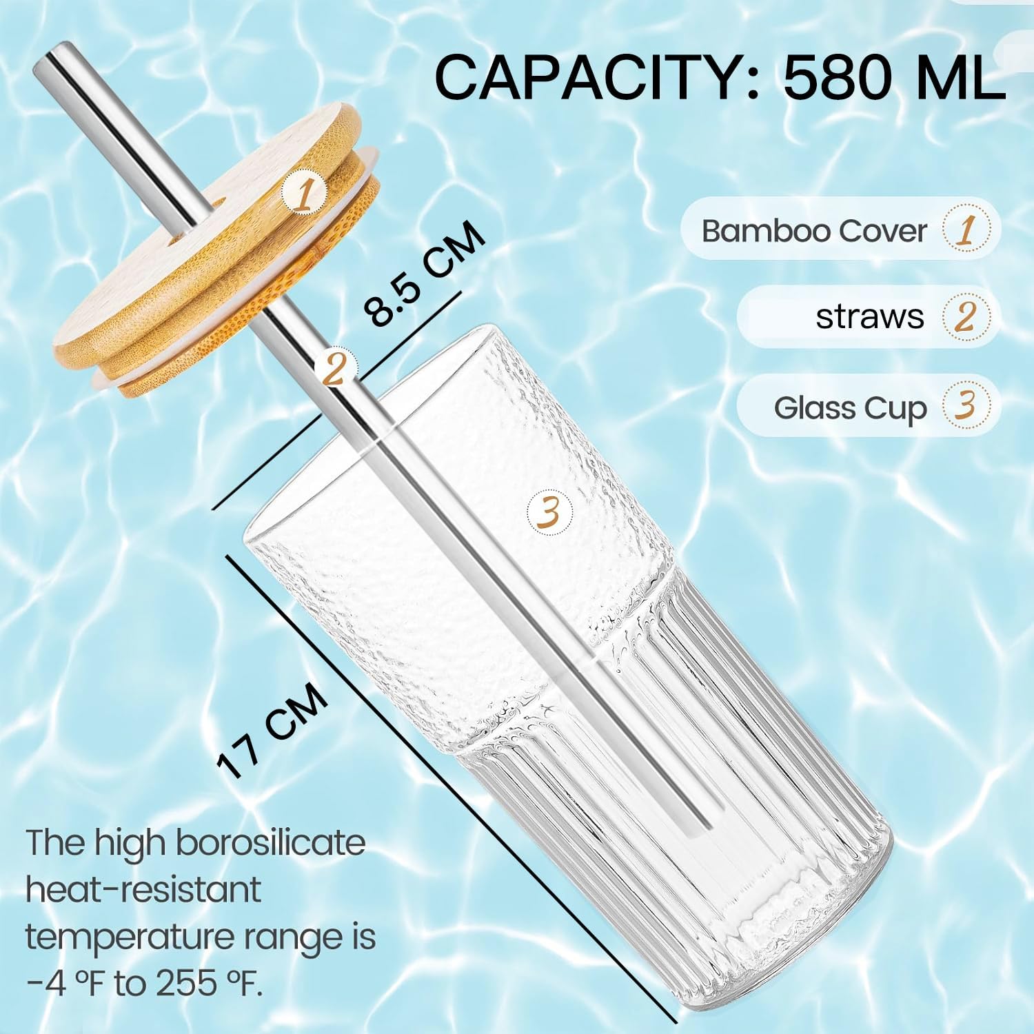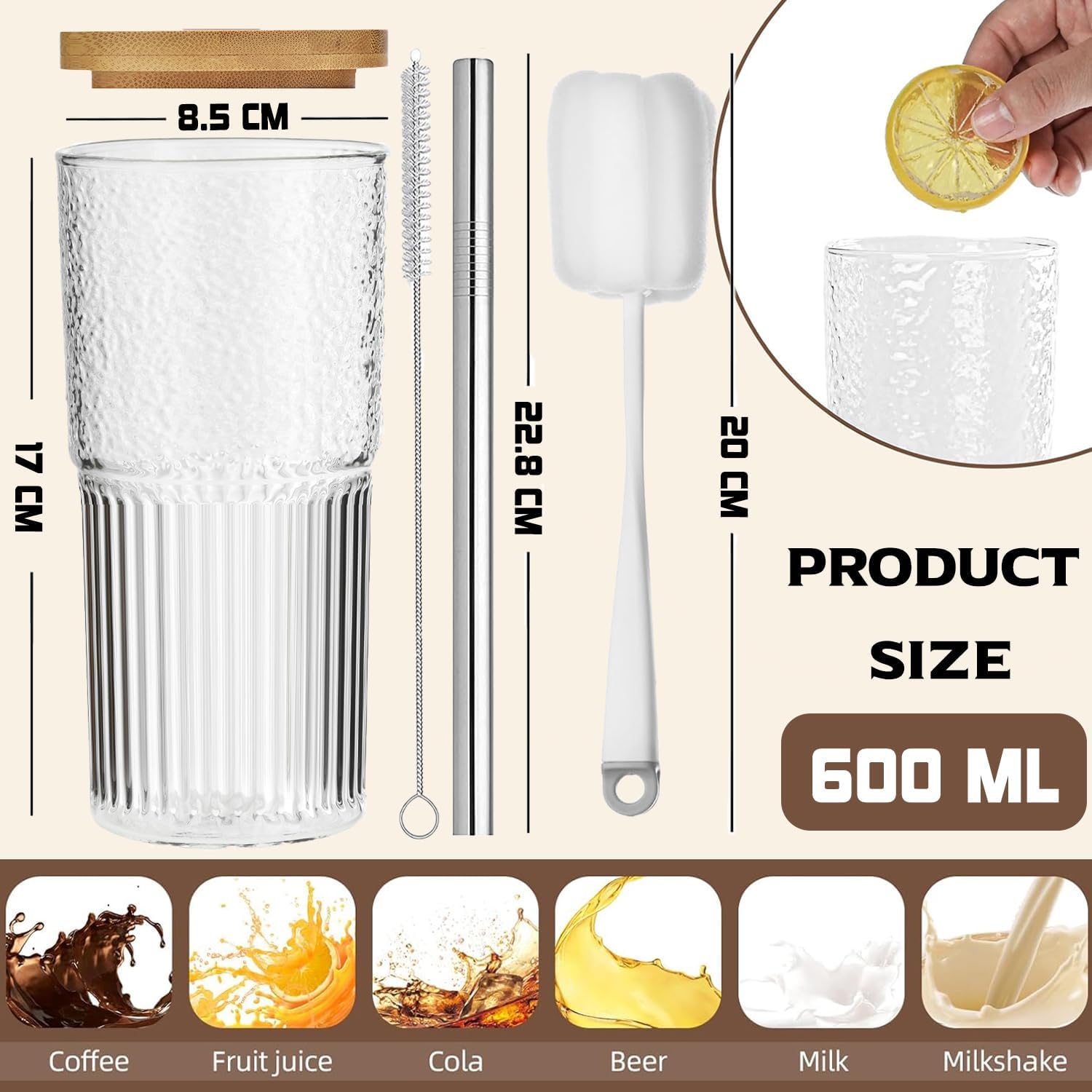 ALINK 2-частични 600 мл прозрачни стъклени чаши за вода на райета с капаци, оребрени чаши за пиене, чаши за вода, чаши за дълги напитки, чаши за ледено кафе, чаши за балон чай