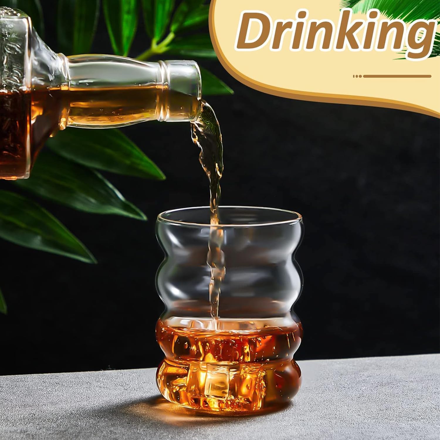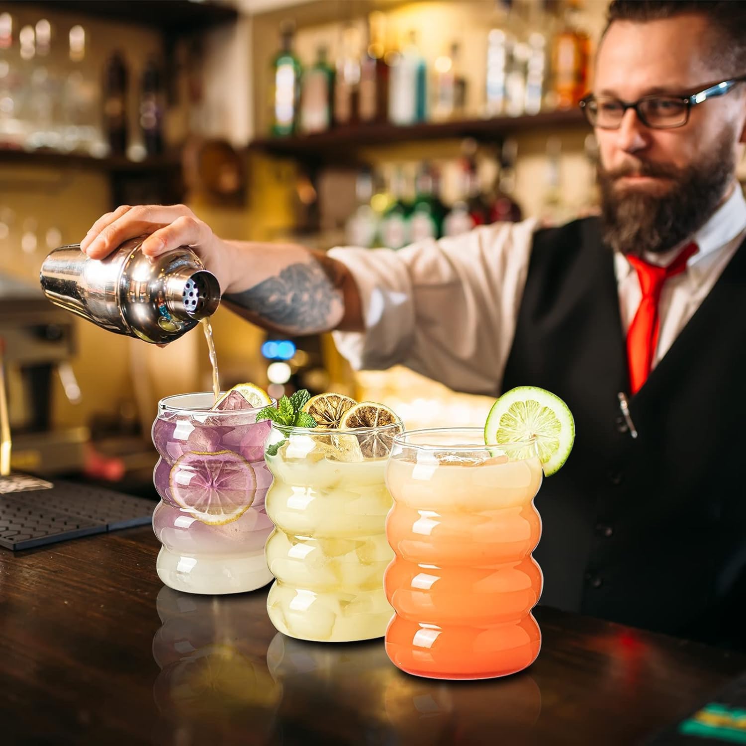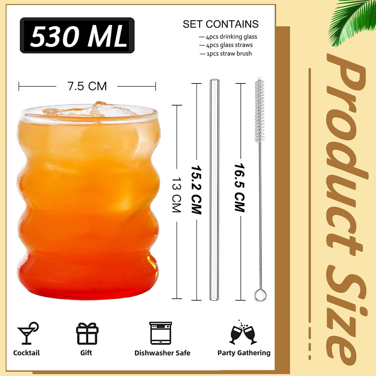 ALINK Чаши за пиене с оребрени форми и стъклени сламки, комплект от 4, 530 мл балонче, чаши за ледено кафе, вълнообразна чаша, чаши за вода, чаши за дълги напитки за коктейли, вода, сода, подарък