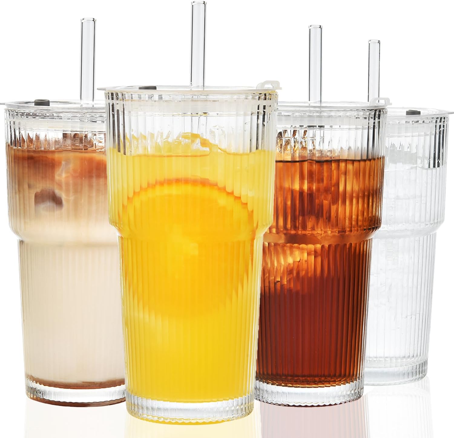 ALINK Комплект от 2 оребрени стъклени чаши с капак и сламка, 600 мл, чаши за ледено кафе, чаши за дълги напитки, чаши за смути, херметичен и водоустойчив дизайн, идеални за кафе