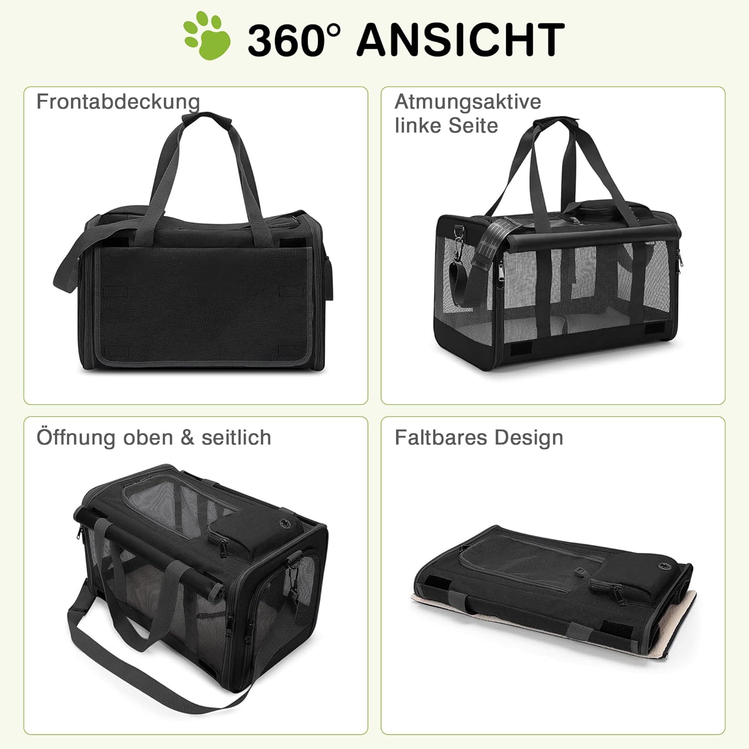 • ПРОСТОРНА ЧАНТА ЗА САМОЛЕТИ С размери 47 x 30 x 30 см, тази чанта за превоз на кучета предлага достатъчно място за котки, малки кучета, кученца или зайци до 9 кг. Идеална е за пътуване със самолет, пътуване с кола, пътуване с влак или посещения при ветеринарен лекар и отговаря на изискванията за ръчен багаж на повечето авиокомпании.