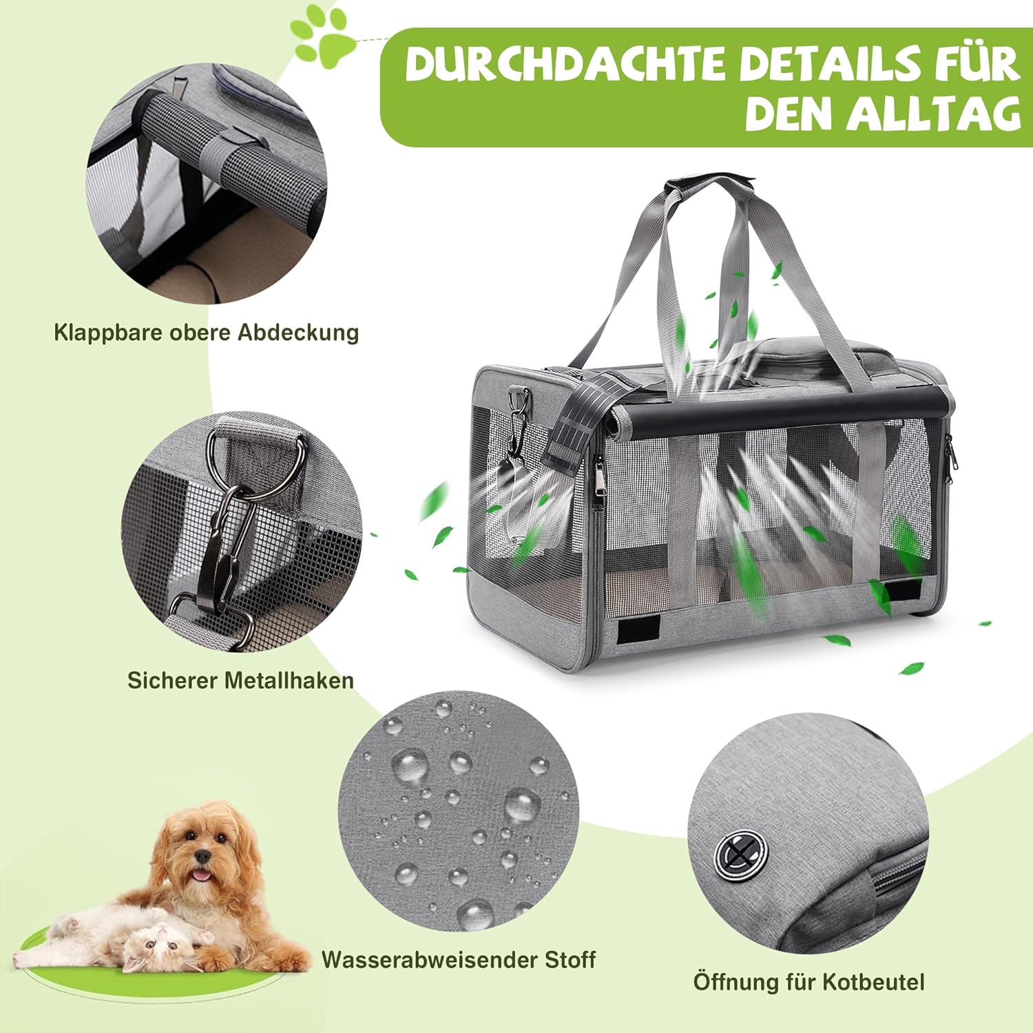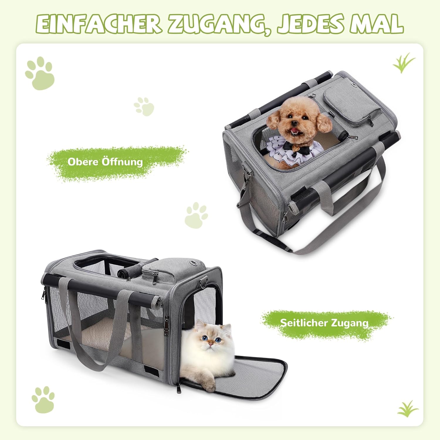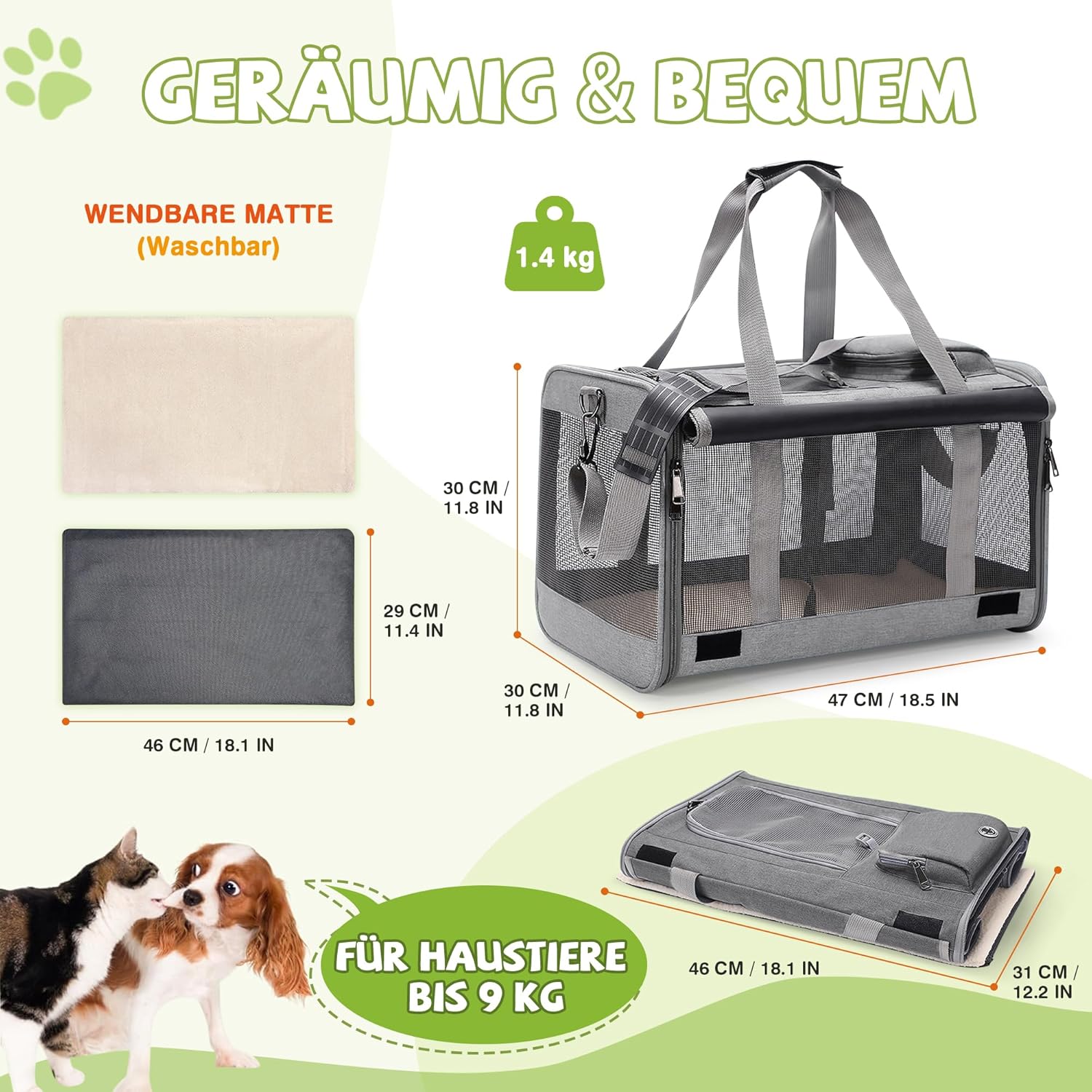 • ПРОСТОРНА ЧАНТА ЗА САМОЛЕТИ С размери 47 x 30 x 30 см, тази чанта за превоз на кучета предлага достатъчно място за котки, малки кучета, кученца или зайци до 9 кг. Идеална е за пътуване със самолет, пътуване с кола, пътуване с влак или посещения при ветеринарен лекар и отговаря на изискванията за ръчен багаж на повечето авиокомпании.