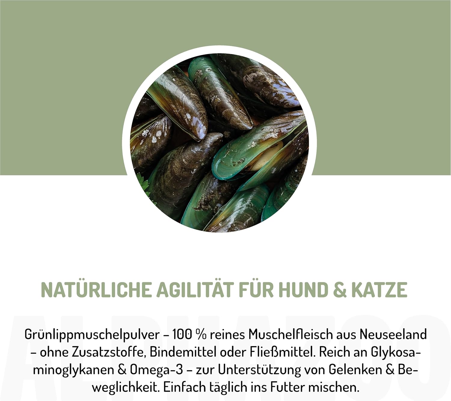 Препоръка за хранене: Моля, спазвайте следните препоръки, за да осигурите оптималната доза за вашия домашен любимец: Кучета до 10 кг: 1,5 г дневно; Кучета от 10 до 20 кг: 3 г дневно; Кучета от 20 до 30 кг: 4,5 г дневно; Кучета от 30 до 40 кг: 6 г дневно; Котки: 1,5 г дневно. Прахът може просто да се смеси с дневната храна. В зависимост от останалата част от диетата на вашия домашен любимец и неговата конституция, индивидуалните нужди трябва да се коригират при хранене със сурова храна. Те могат да се различават от горните препоръки. Инструкции за съхранение: Моля, съхранявайте на хладно и сухо място, далеч от светлина.