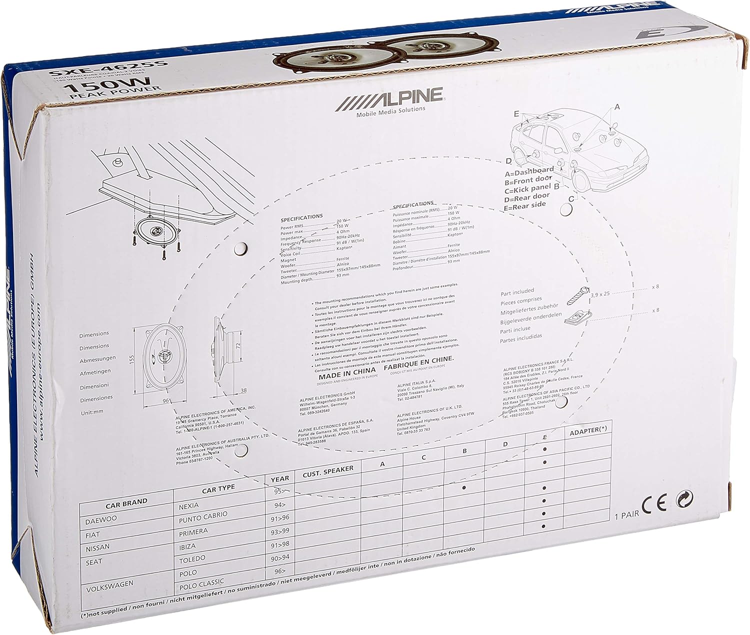 Alpine SXE-4625S - 10x15 см (4x6 инча) двулентови коаксиални високоговорители, 60 W, черни