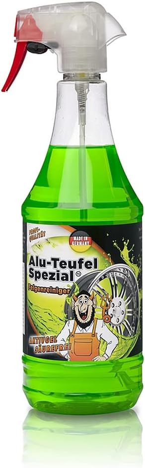 Alu-Teufel Специален почистващ препарат за джанти – Зелен – 1000 мл – Победител в теста Alu-Teufel Spezial, специалният почистващ препарат за нови или гланцирани джанти, които са хромирани, полирани или анодизирани. Alu-Teufel лесно почиства всички алуминиеви джанти. Върху джантата се образува молекулярен защитен слой, който предотвратява образуването на силно замърсяване при редовна употреба. Alu-Teufel предпазва декоративните пръстени, твърдите хромирани брони и лайсни от ръжда (м). Този почистващ препарат е толкова мек, че боята (м), пластмасата или гумата не се засягат. Той лесно почиства леки до много силни замърсявания. Дори спирачният прах, който съществува от години, изчезва като сняг от слънцето. Освен това, този почистващ препарат за джанти премахва дори упорити замърсявания, без да засяга третираните повърхности. Alu-Teufel прави това, като има защитен ефект върху всички видове метали. Този продукт е биоразградим. Начин на употреба: напръскайте продукта върху джантата, оставете го за 2 до 4 минути, след което почистете с водоструйка. Този продукт се предлага в бутилка със спрей от 1000 мл. Нашият съвет: използвайте Alu-Teufel, когато миете колата си ежеседмично, за да постигнете най-добър резултат!