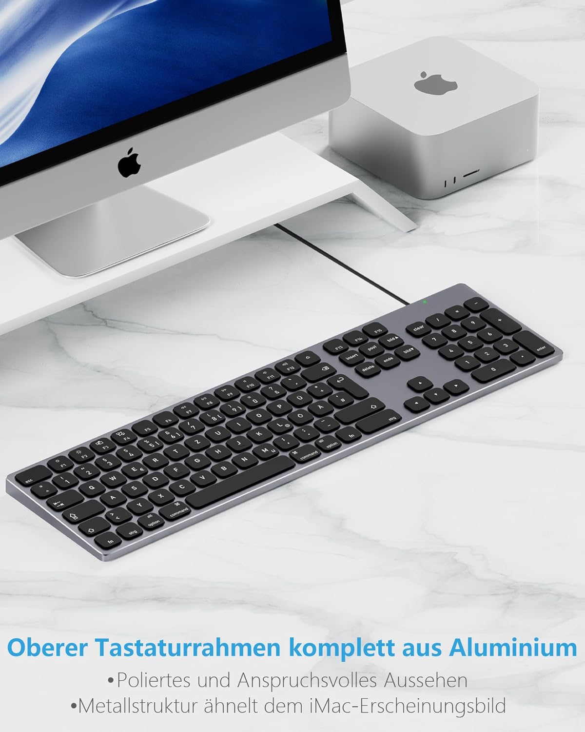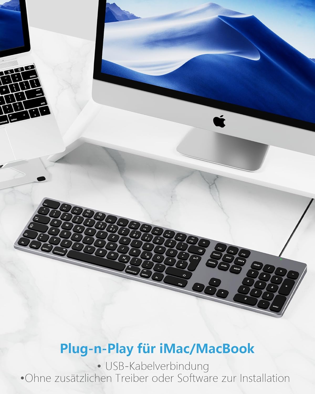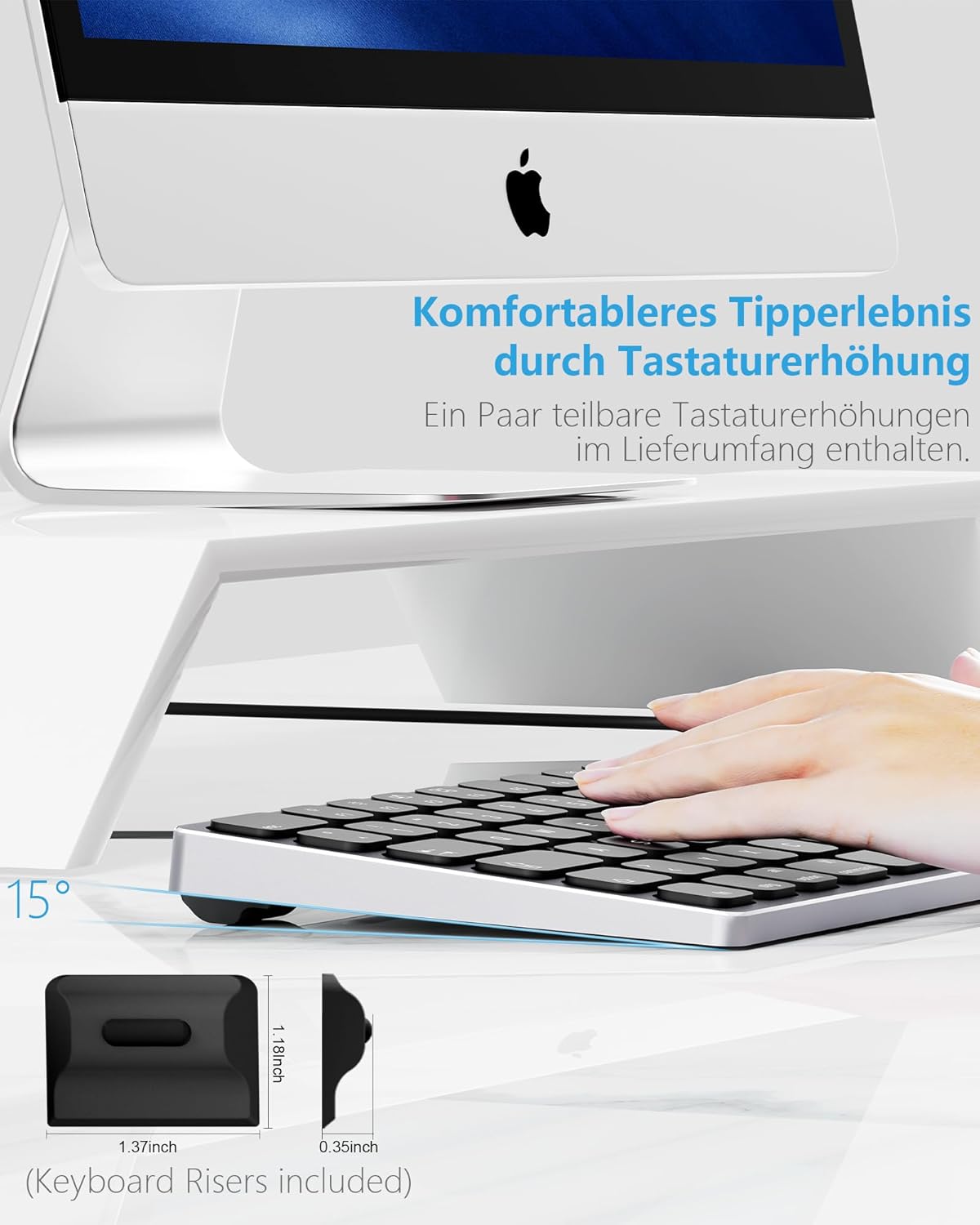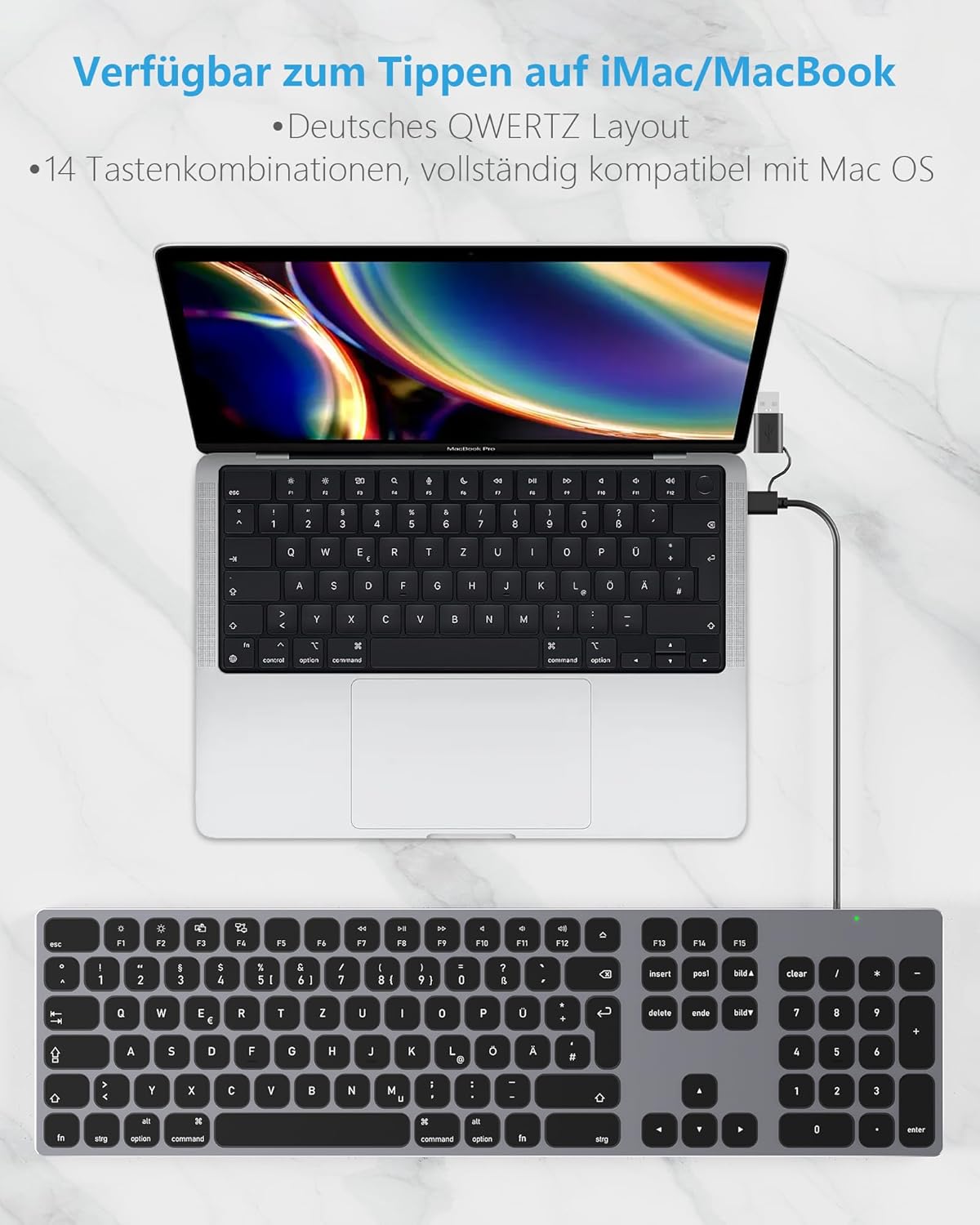 Подредба на клавиатурата: Qwerty (немска) Размери на продукта: 16,6 инча x 4,47 инча * (0,19 ~ 0,4) инча Тегло на продукта: 0,4 паунда Съвместимо устройство: iMAC/Mac Mini компютър или MacBook Pro/Air лаптоп (PS: Ако клавиатурата работи с Windows OS, но някои от клавишните комбинации не са налични) Работни клавиши: 106 клавиша. Съдържание на кутията: 1 x ръководство (английски език не е гарантиран)