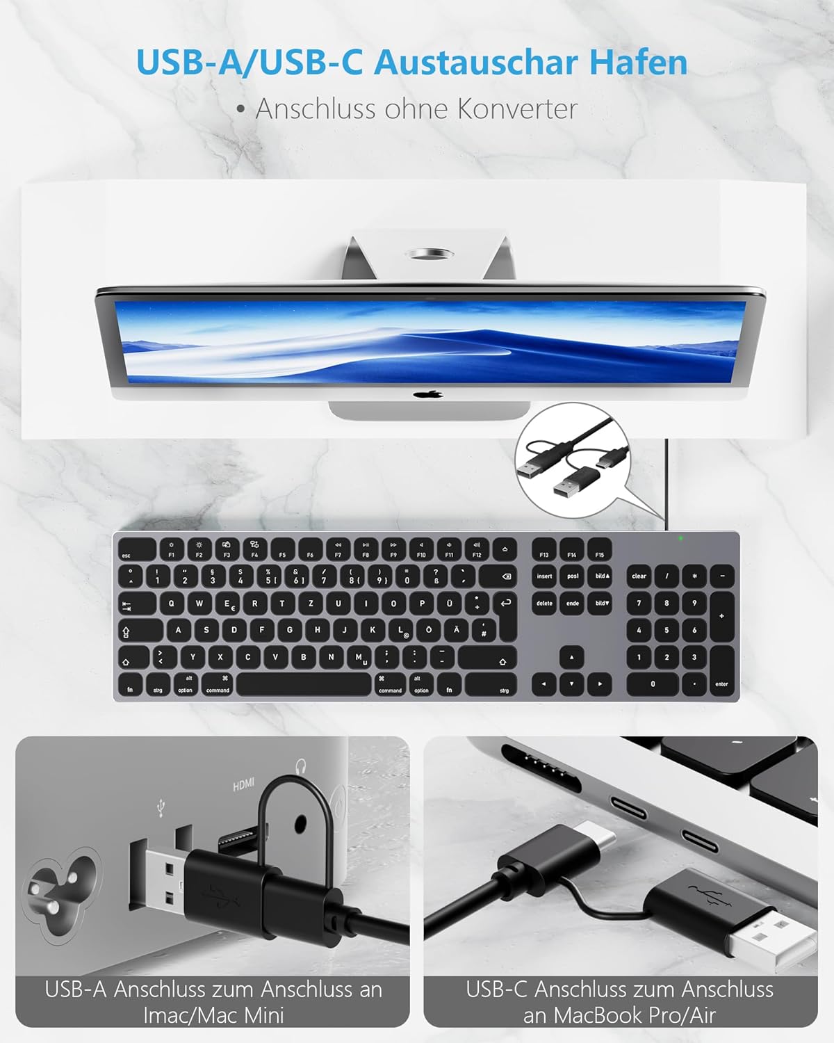The interchangeable USB-A and USB-C port (Type-C) ensures that the keyboard works not only with iMac/iMac Mini computers, but also with MacBook Pro/Air laptops.