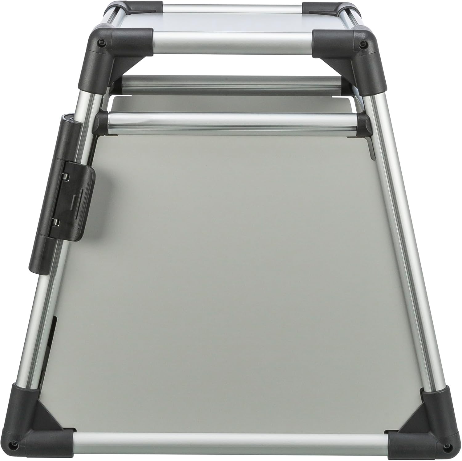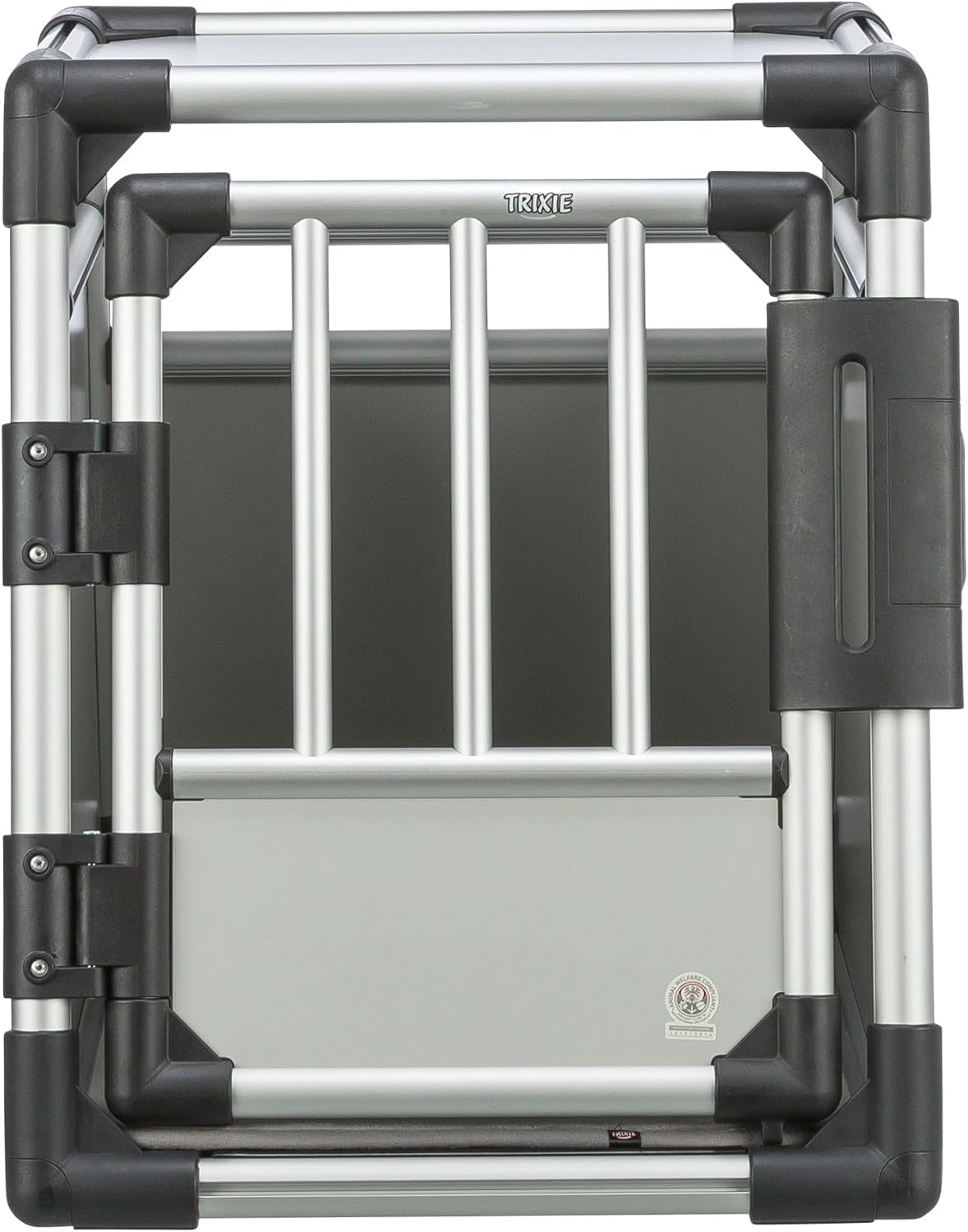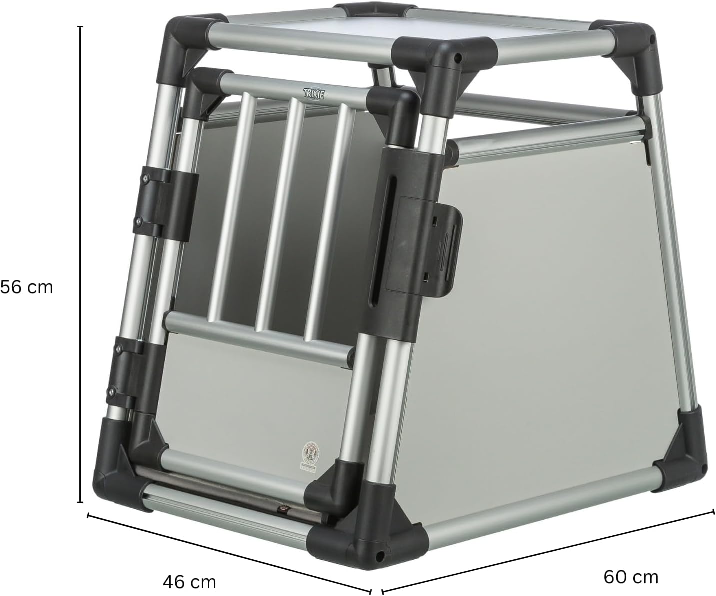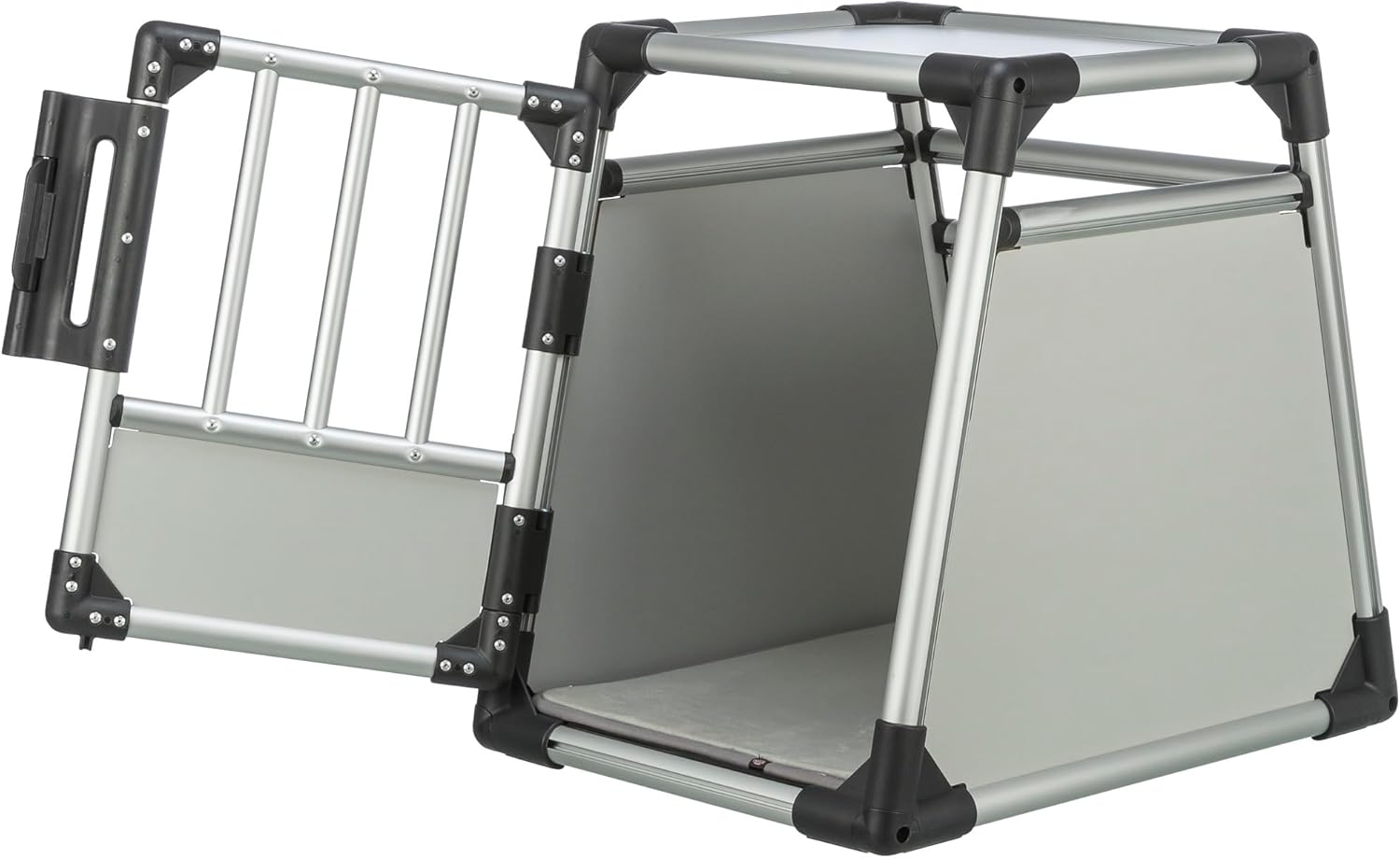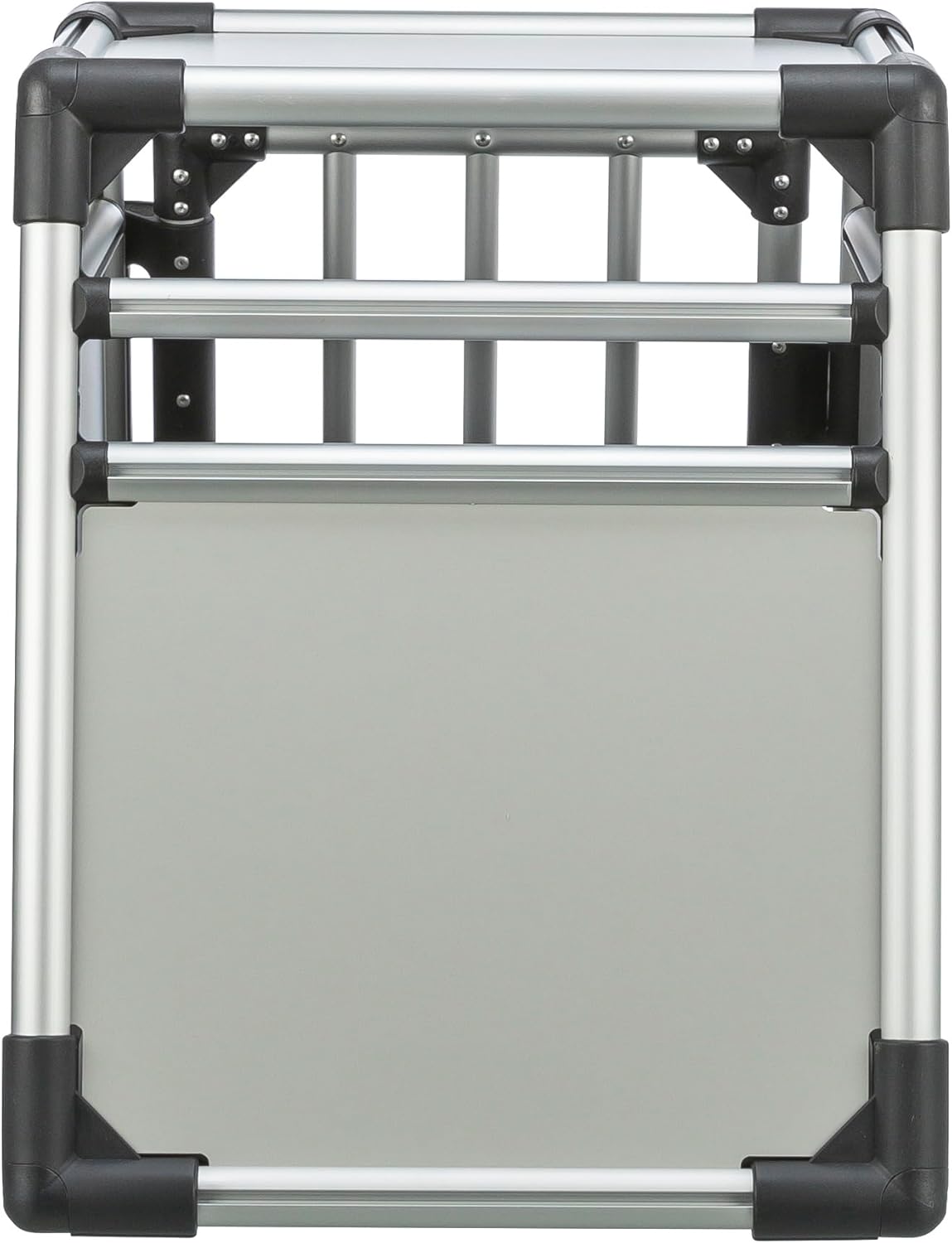 Алуминиева кутия за транспортиране на кучета TRIXIE, S: 48 × 57 × 64 см, светло сива/сребриста, изключително стабилна, безопасна, тиха, с неплъзгаща се подложка с велкро лента на основата, 39340