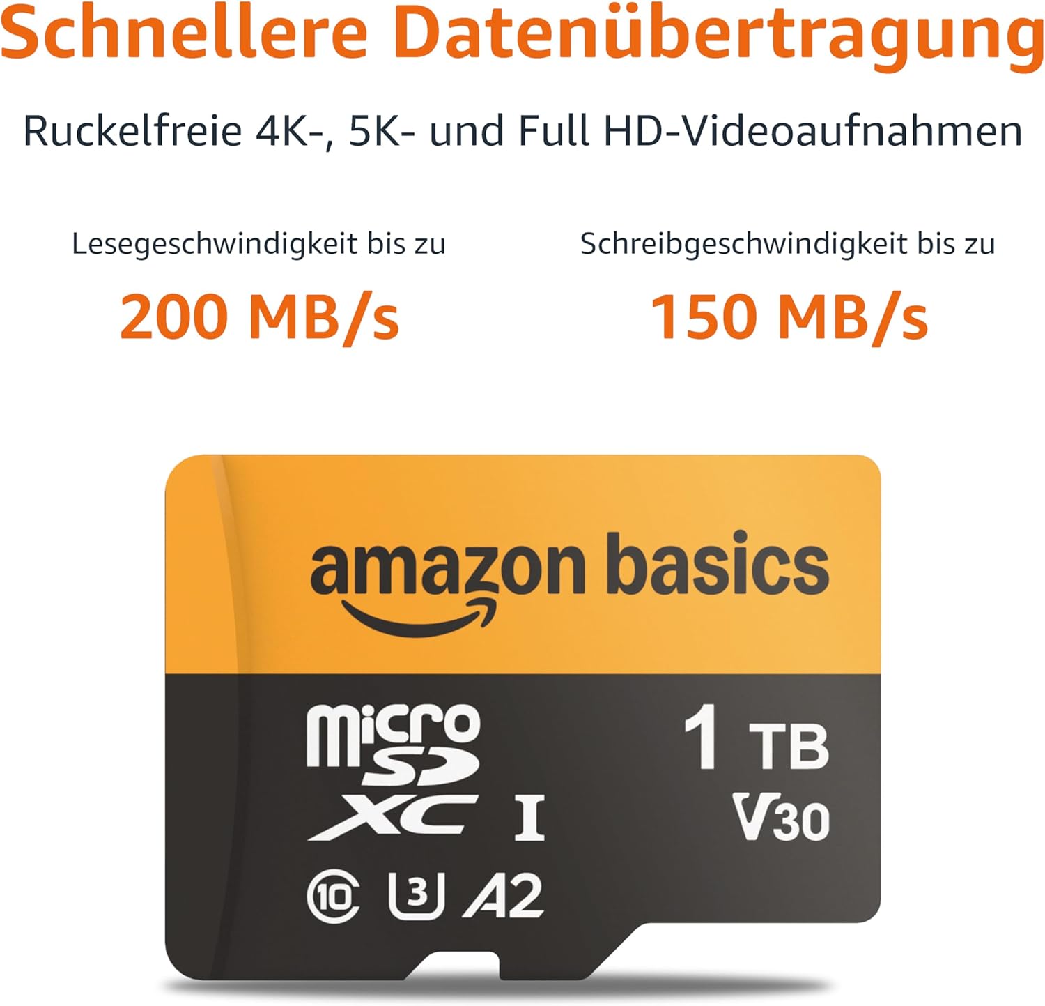 Amazon Basics 1TB microSDXC карта с адаптер, скорост на четене до 200MB/s - пакет от 1