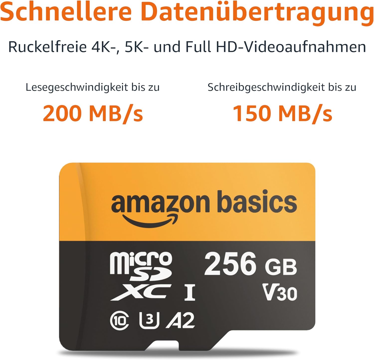 Amazon Basics 256GB microSDXC карта с адаптер - скорост на четене до 200MB/s - пакет от 1