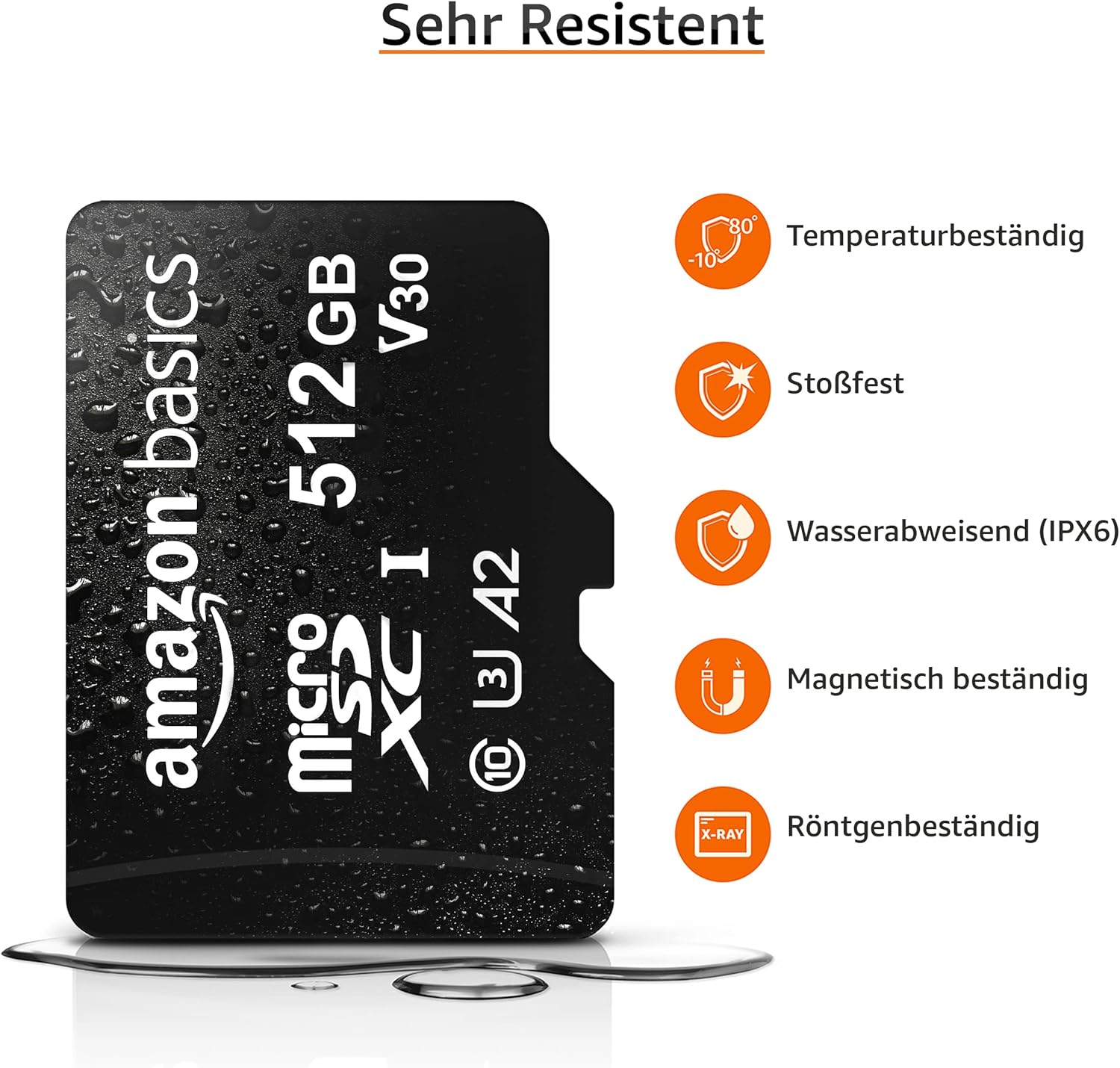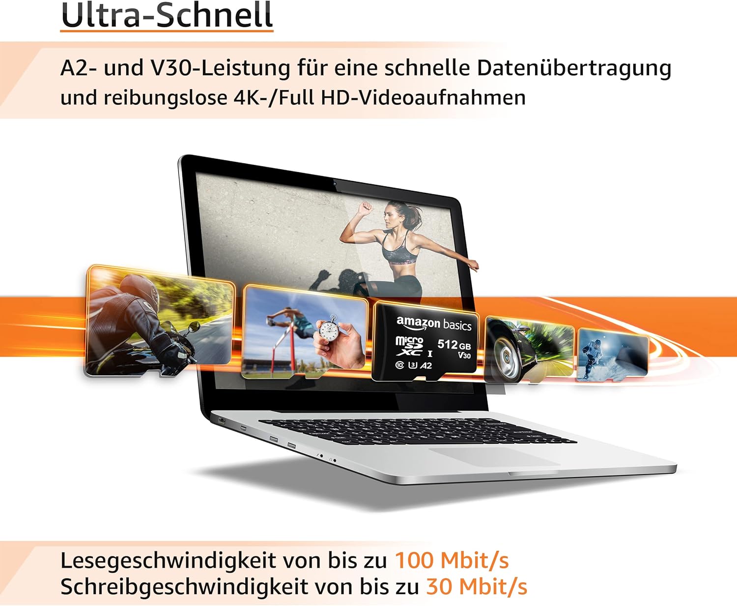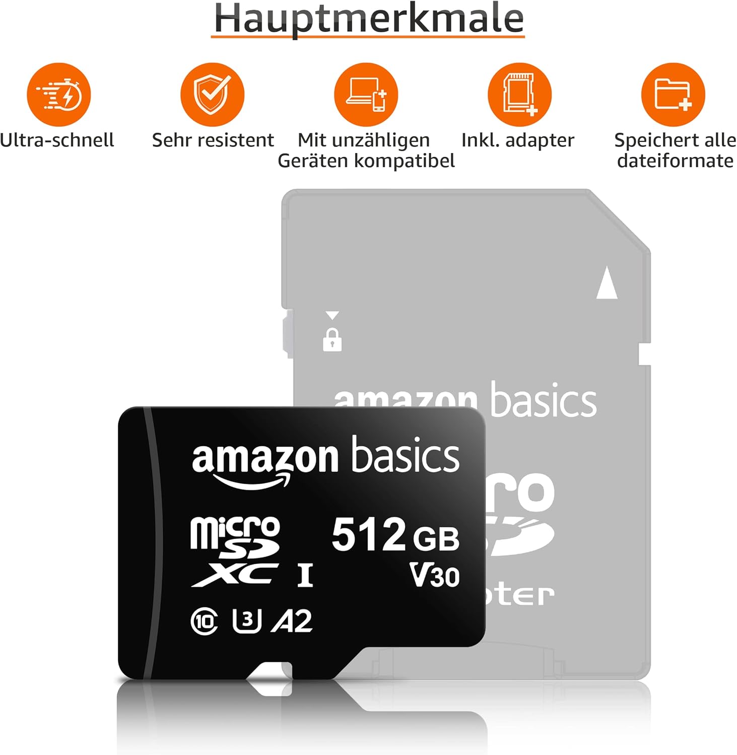 Amazon Basics MicroSDXC 512GB с SD адаптер A2 U3 Скорост на четене до 100MB/s - Черен