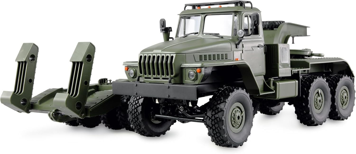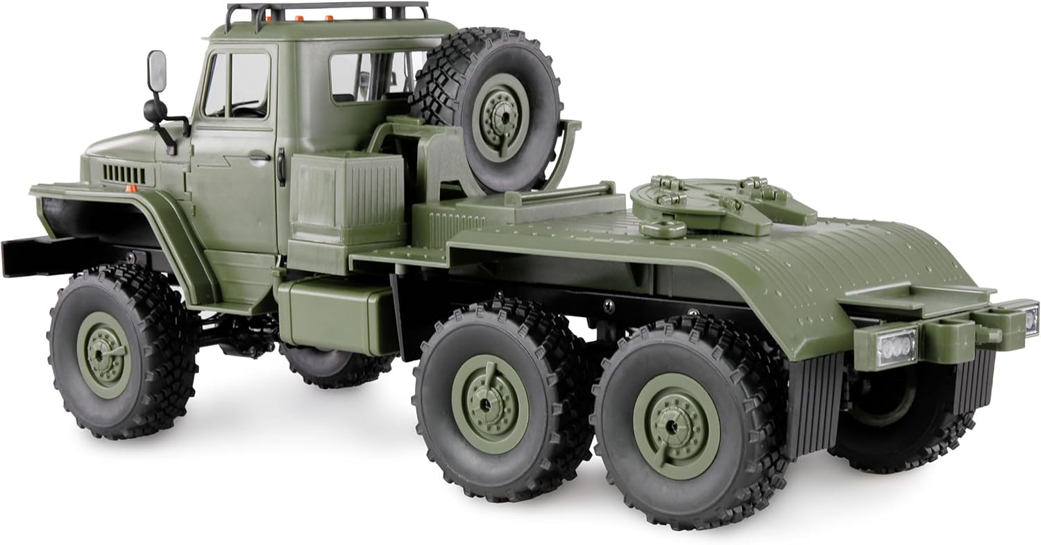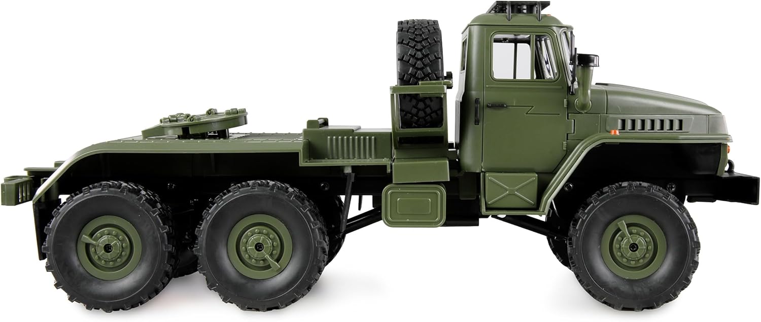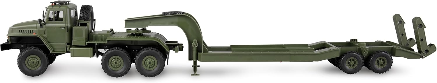 Урал Б36 е руски военен камион, произведен за първи път от УралАЗ през 1941 г. и известен със способността си да работи в трудни терени и метеорологични условия. Използван главно за транспортиране на войски и военни материали, той остава в употреба през годините благодарение на своята надеждност. Дори днес той все още се използва от въоръжените сили. Това мащабно копие на историческия военен транспортер Урал в мащаб 1:16 предлага оптимално разпределение на мощността благодарение на задвижването си на 6 колела и следователно е идеално за вълнуващи офроуд пътувания. Дори тежки товари като танкове за войски или подобни модели от този размер могат лесно да бъдат транспортирани. 280-милиметров четен двигател и многостепенна предавка осигуряват необходимата производителност. Моделът е оборудван с електронна защита от преобръщане (планинска спирачка), която осигурява сигурно задържане и прецизен контрол в труден терен. Гумените гуми с високо сцепление на всички оси и телескопичните задвижващи валове позволяват максимално блокиране на осите без загуба на задвижваща мощност. Листови пружини като оригинала и безсмущаваща 2,4 GHz система допълват оборудването. С LED осветление за автентичен мащабен вид, дори пътуванията привечер са възможни без никакви проблеми. Нискорамната платформа може да се откачи, така че тракторът да може да се управлява без ремарке. Версията RTR (готова за работа) включва дистанционно управление, батерия и кабел за зареждане. Голяма литиево-йонна батерия позволява дълго време на шофиране до 20 минути. Отделението за батерията под капака позволява бърза смяна на батерията.