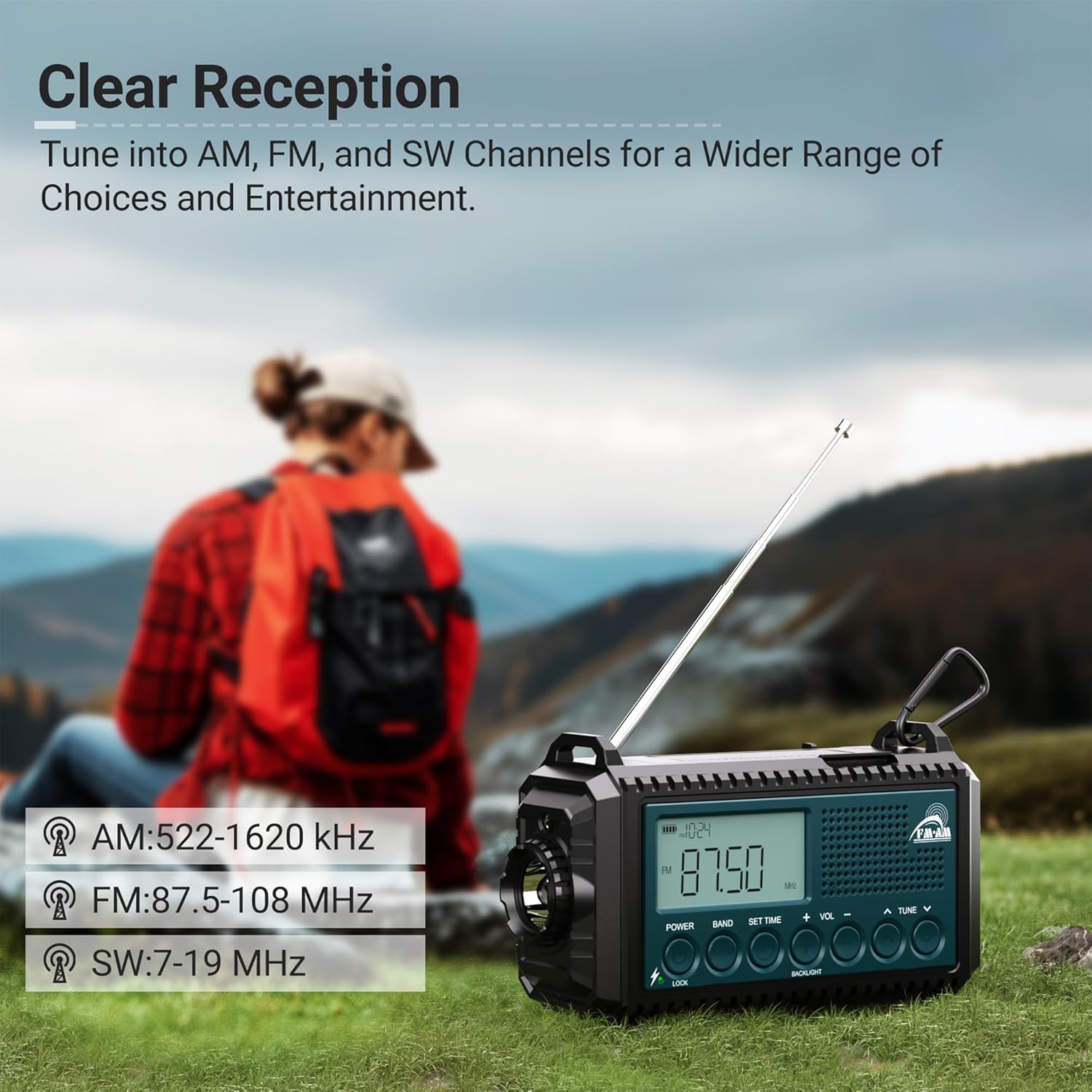 • SOS-ALL-ALL & ВОДОУСТОЙЧИВО IP: Соларното радио за открито е много подходящо за дейности на открито, като къмпинг и планинарство. Ръчната каишка и карабинерът улесняват закрепването му към раницата. Когато сте в опасност, моля, натиснете бутона SOS, радиото с манивела ще мига в червено и ще издаде звук, достатъчно силен, за да привлече вниманието на спасителите. Водоустойчиво IPX4, малки капки дъжд, пръскащи се върху устройството, няма да го повредят. Забележка: Не потапяйте във вода.