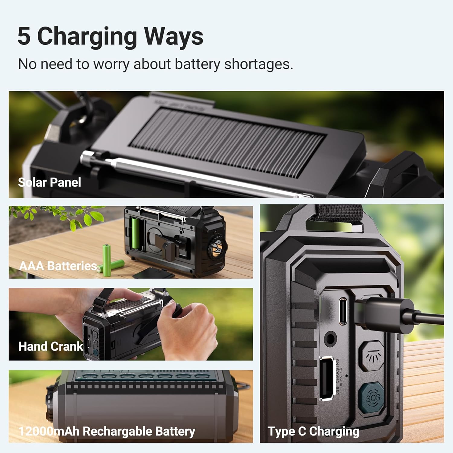 • Пет режима на зареждане и захранващи ръчки: преносимо радио чрез Type-C кабел, соларен панел, AAA батерия (не е включена), вградена батерия с голям капацитет или ръчна манивела. Тъй като слънчевият панел е малък и служи основно за удължаване на живота на батерията, е много трудно устройството да се зареди напълно само със слънчева енергия. В случай на спешност или когато няма електричество на открито, можете да използвате ръчната манивела за аварийно зареждане. Зареждането чрез Type-C е най-ефективният и бърз начин за зареждане на това радио при ежедневна употреба.