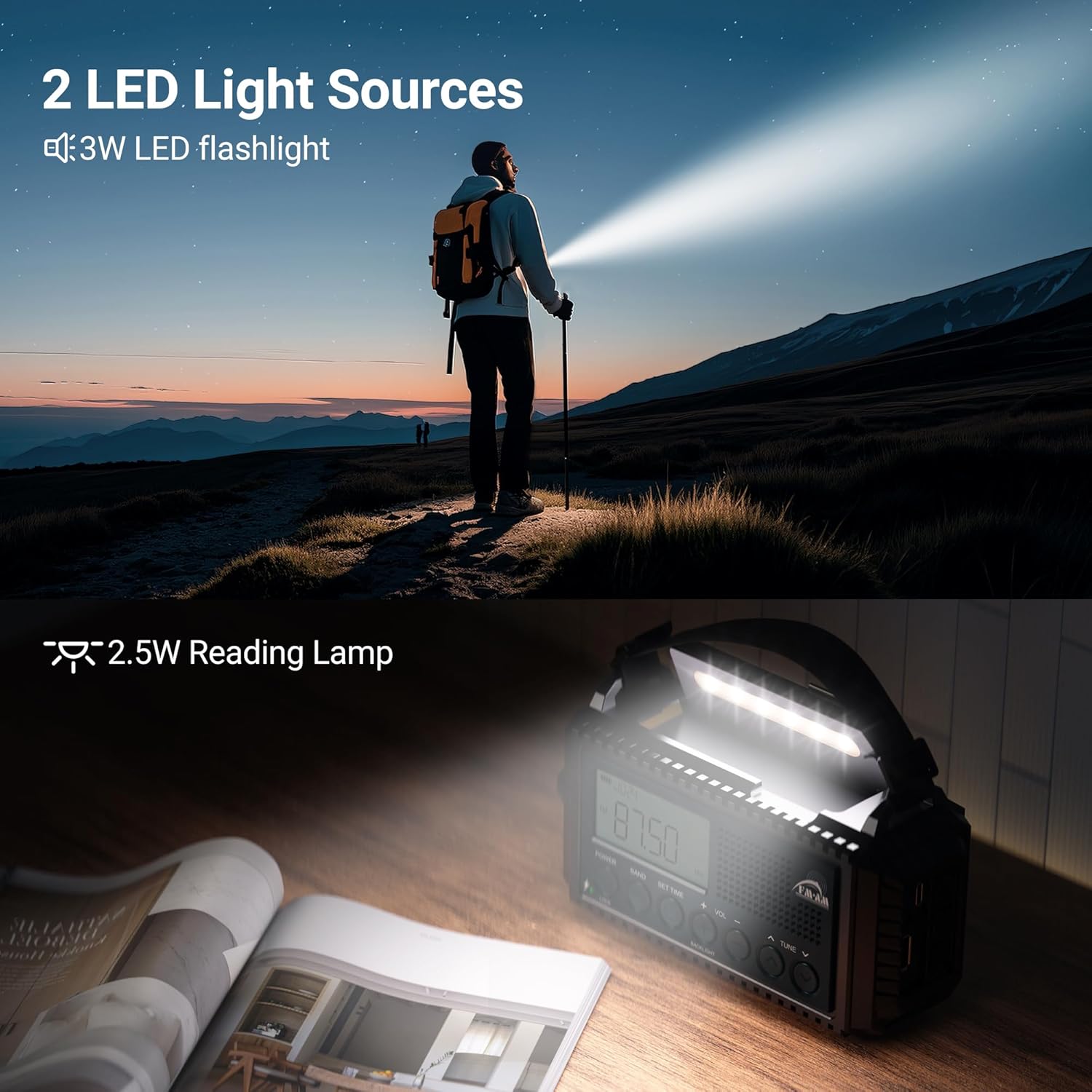 • Светлина и сгъваема светлина: слънчевото радио има фенерче и лампа за четене, има две опции за яркост: висока яркост или нормална яркост. Яркото фенерче може да ви осигури светлина и по-добро виждане в тъмното, а сгъваемата лампа за четене може да регулира ъгъла за лесно четене през нощта. Отговаря на вашите различни нужди за нощна употреба.