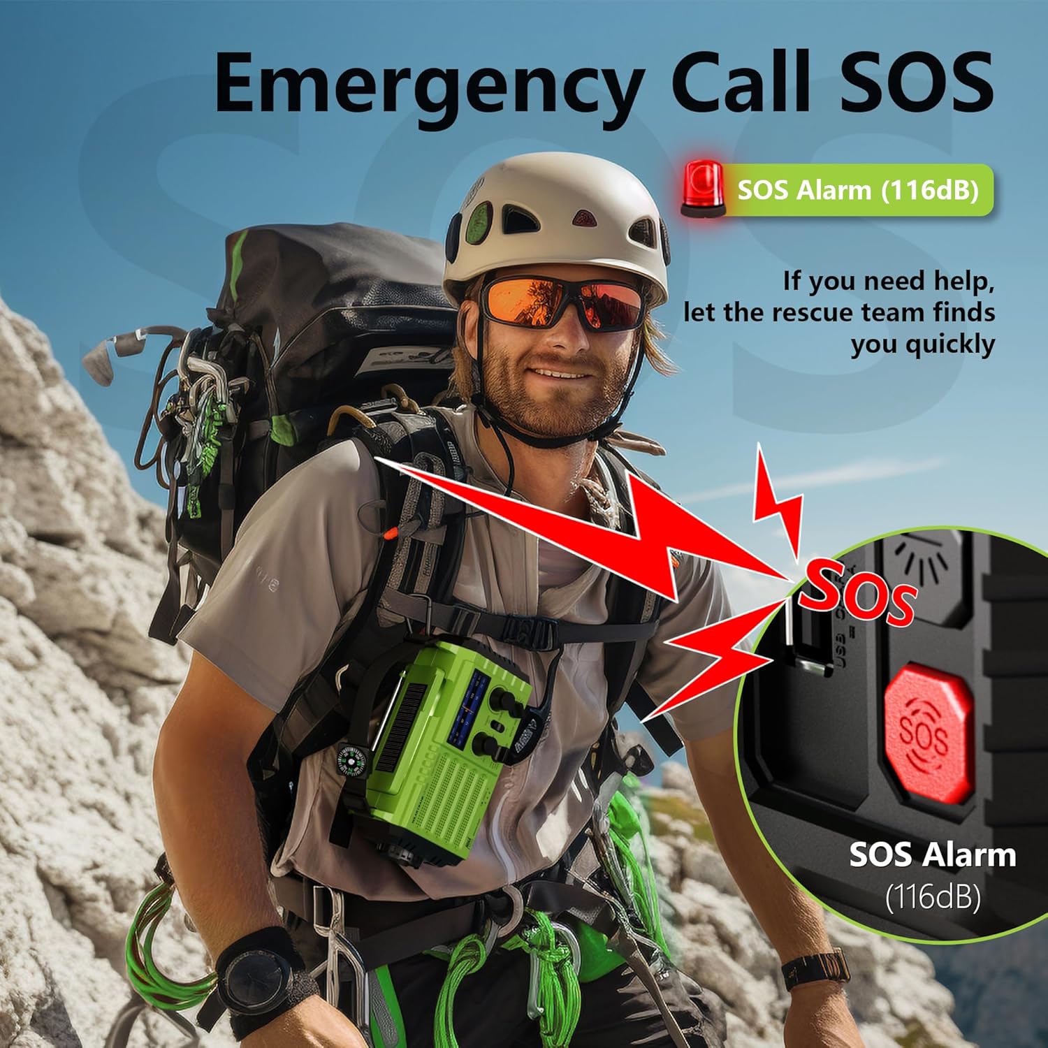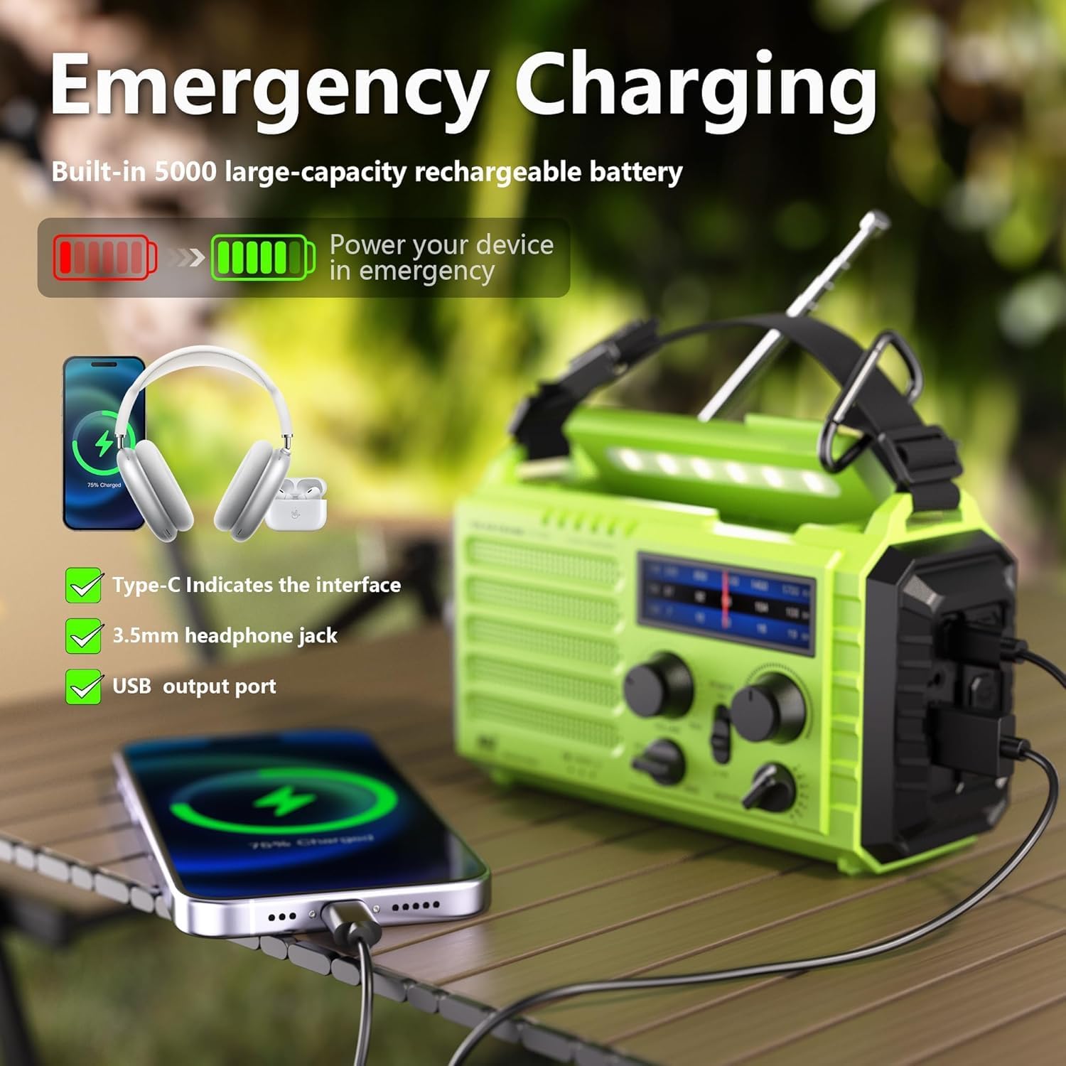 Portable emergency radio for emergency preparedness applications, indoor domestic use or outdoor emergencies such as camping, backpacking and travel. It also helps you stay up to date in storms such as floods, tornadoes, thunderstorms and other warnings.