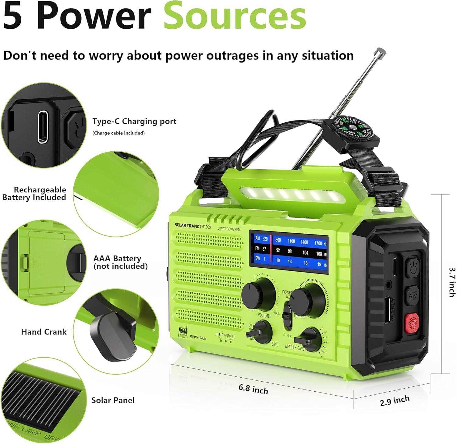 Designed for emergency situations, offers different methods to power yourself: Solar field, hand crank, rechargeable 4000 mAh battery, 5 V USB input, 3 AAA batteries to keep you up to date!